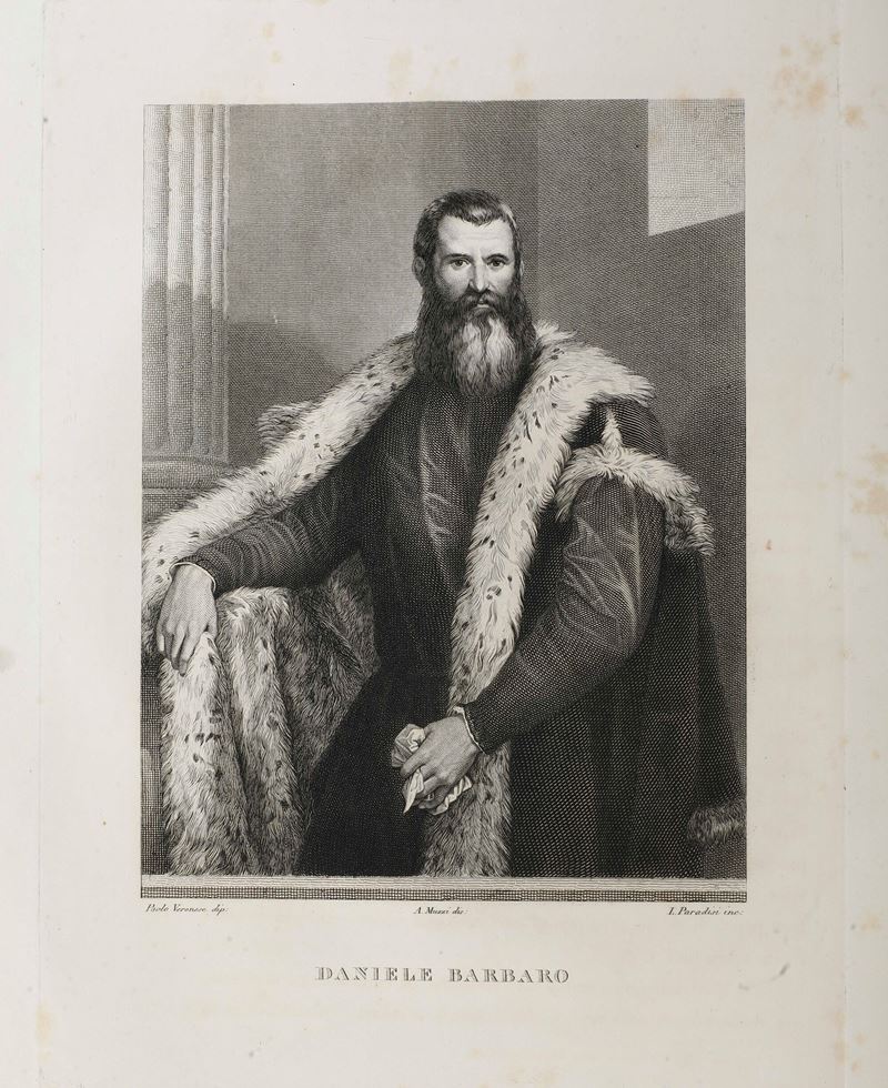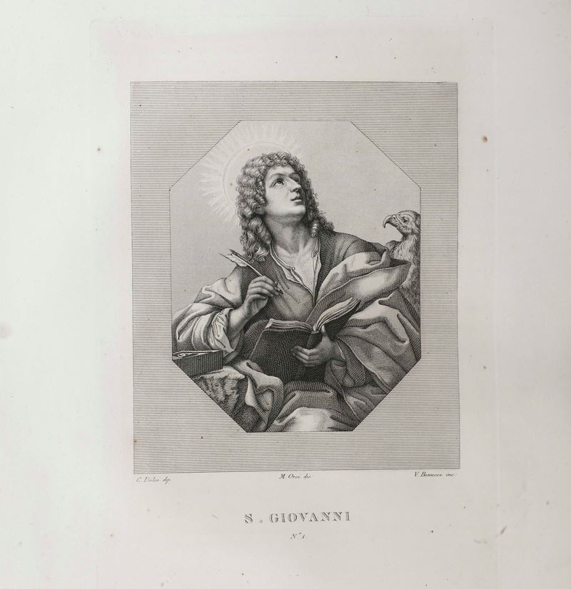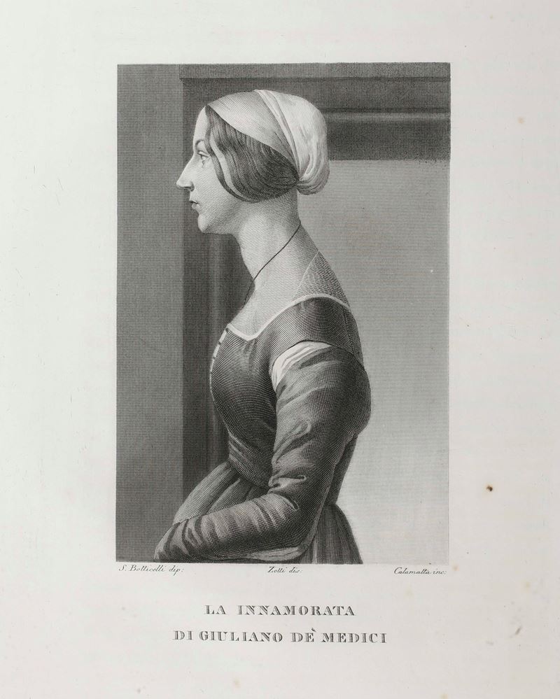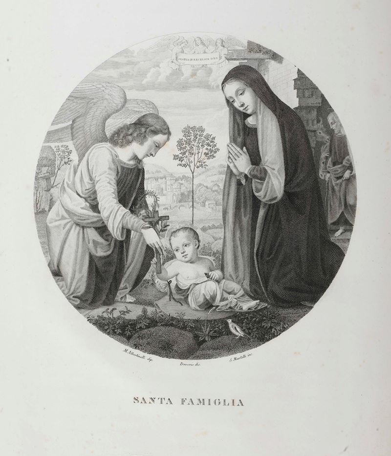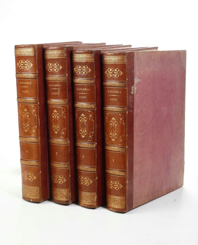 In-folio. Quattro volumi. Rilegature coeve in mezza pelle e tela percallina. Monumentale raccolta di tavole incise con dettagliate schede esplicative riguardante la pinacoteca di Palazzo Pitti a Firenze. Buon esemplare genuino. 1837-1842