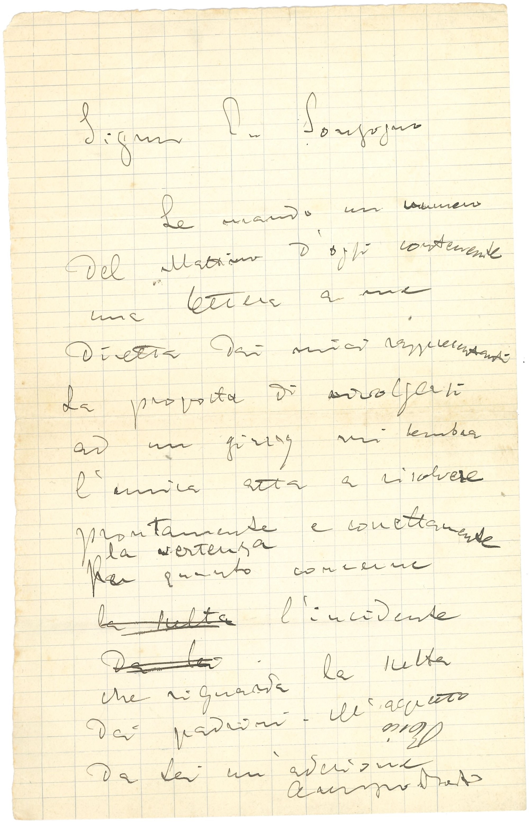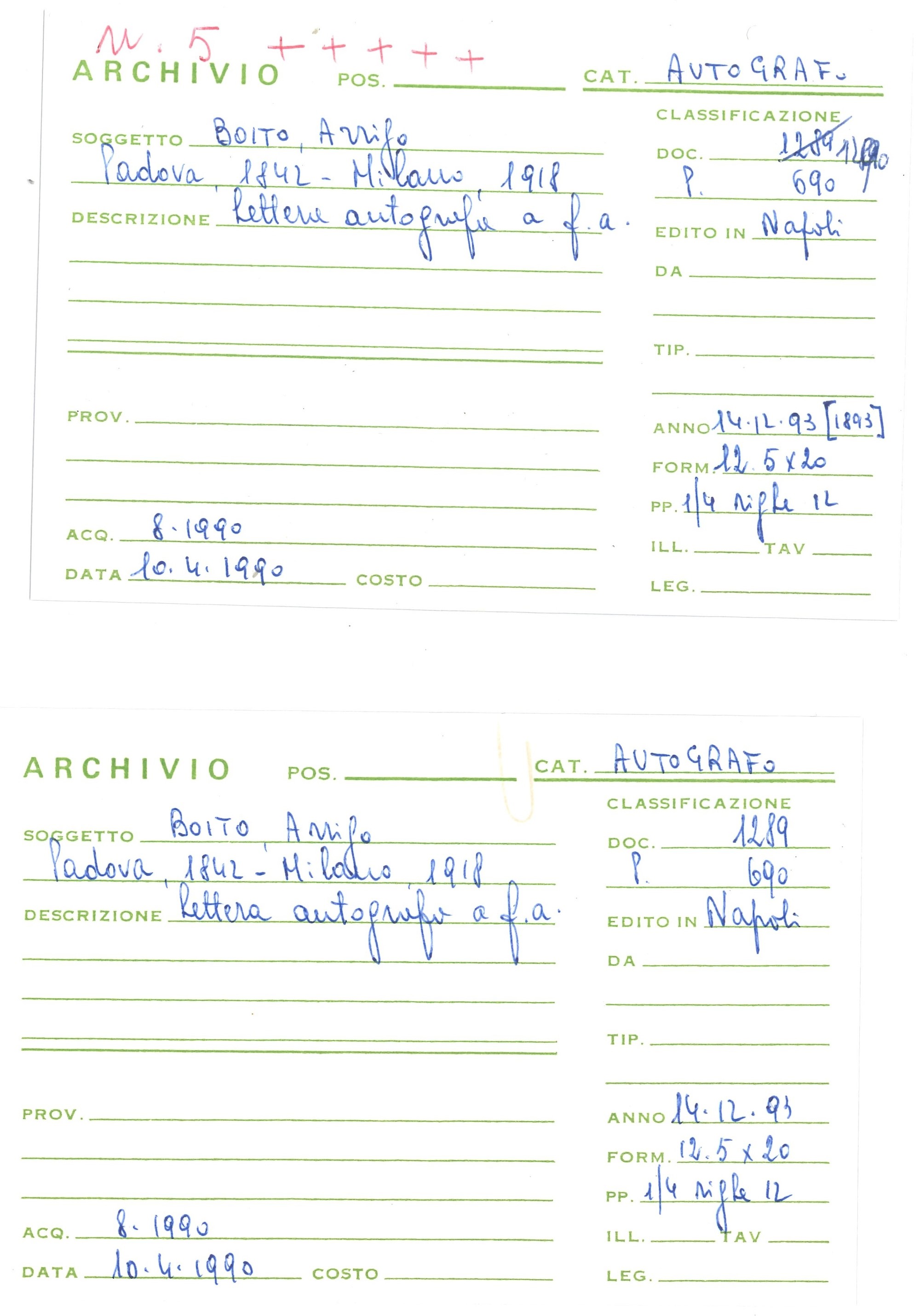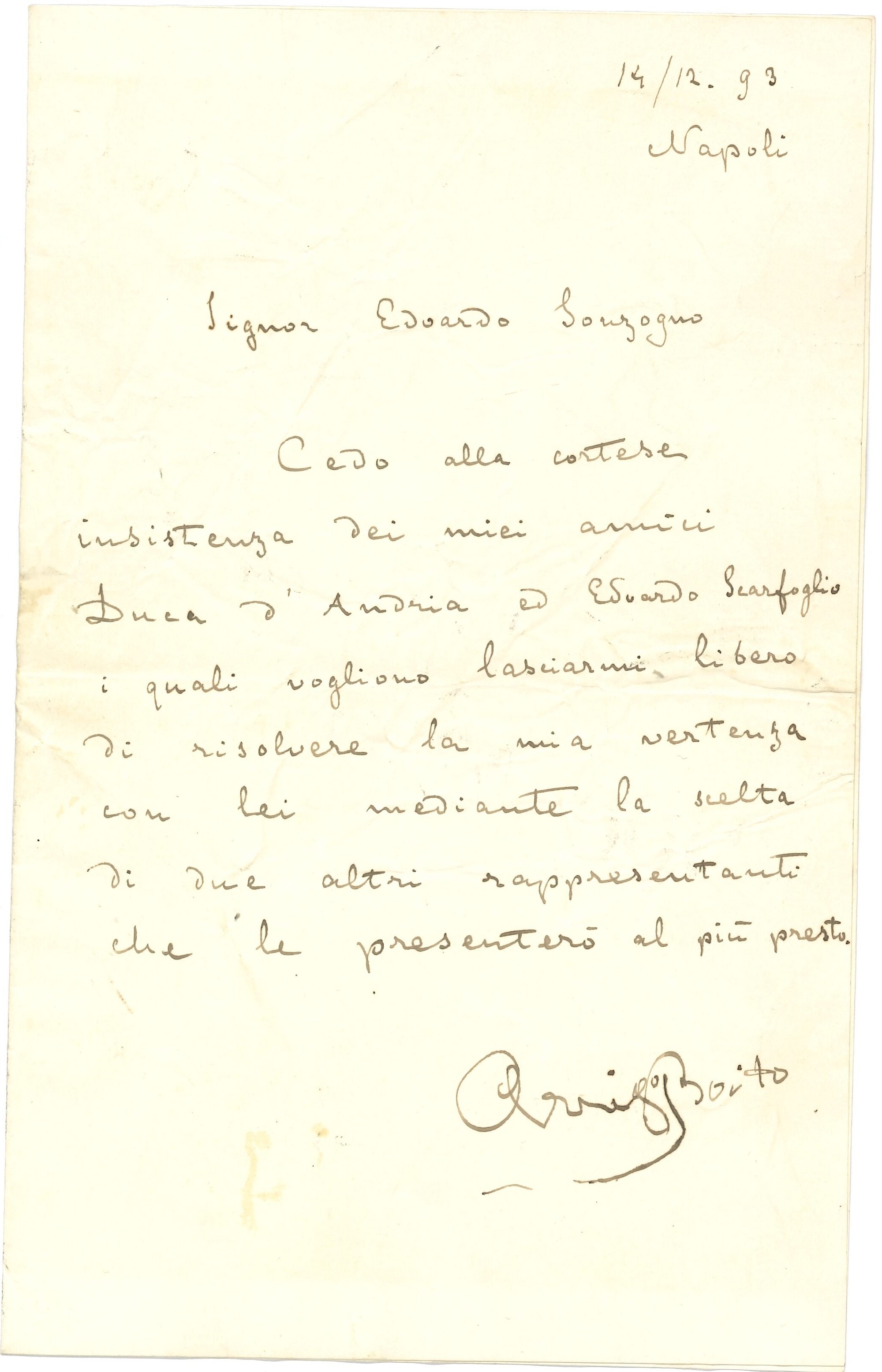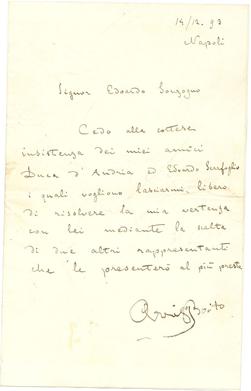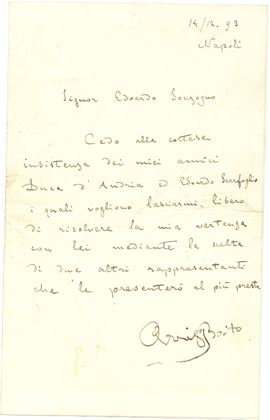 Una delle lettere a Sonzogno datata Napoli, 14-12-1893. Tutte e tre le lettere composte da una facciata manoscritta. Particolarmente interessanti le lettere a Sonzogno, relative a una "vertenza" con il mittente