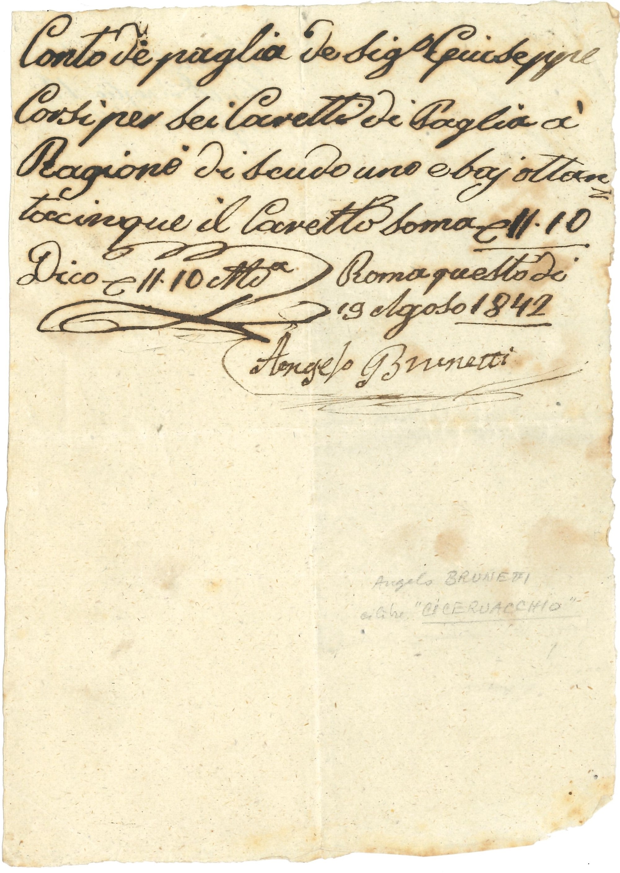 Documento datato 19-08-1842. Una facciata manoscritta. Rarissimo autografo del popolare patriota romano relativo ai conteggio per una fornitura di paglia