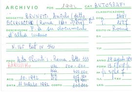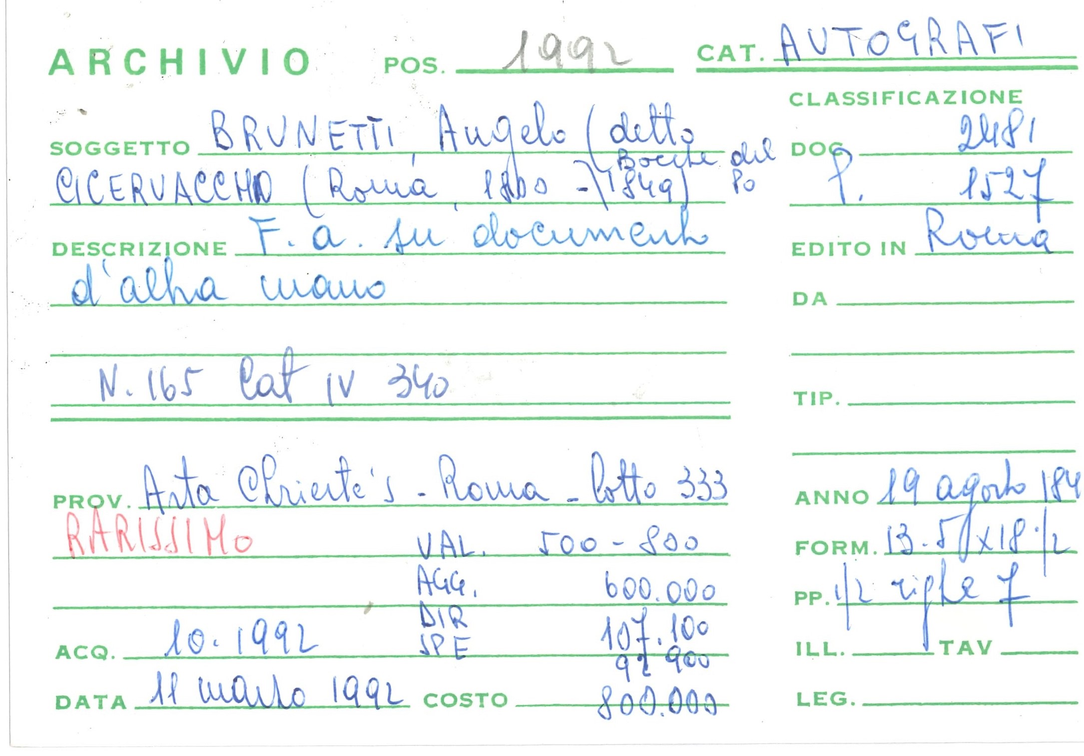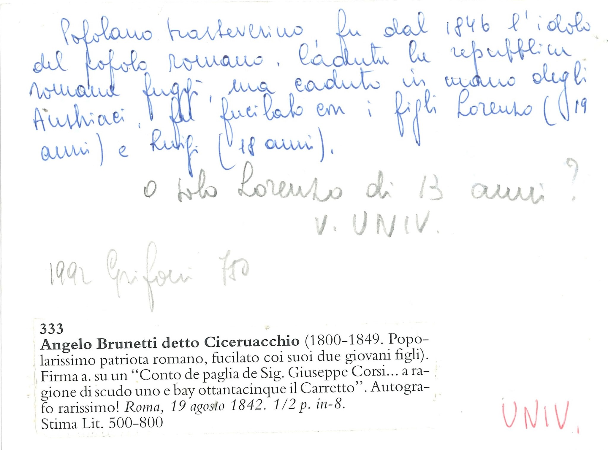 Brunetti Angelo detto Ciceruacchio (1800-1849) Conto autografo