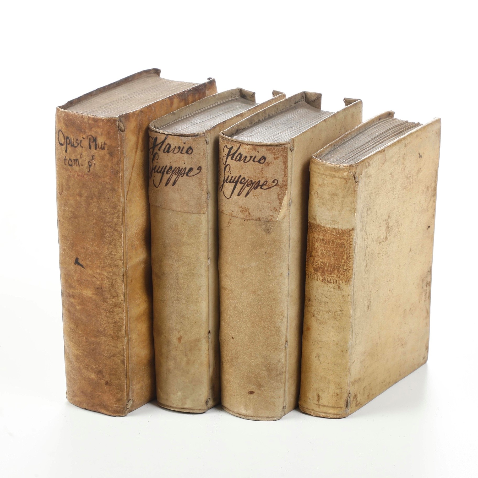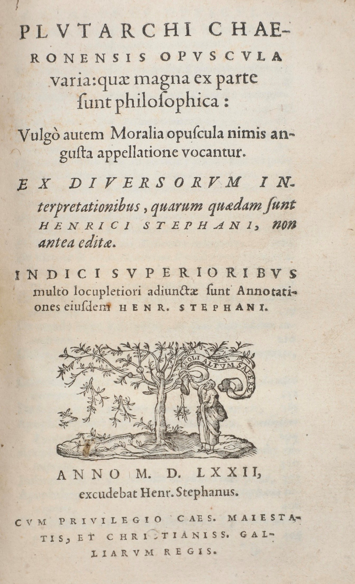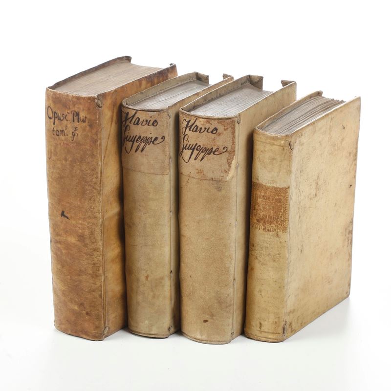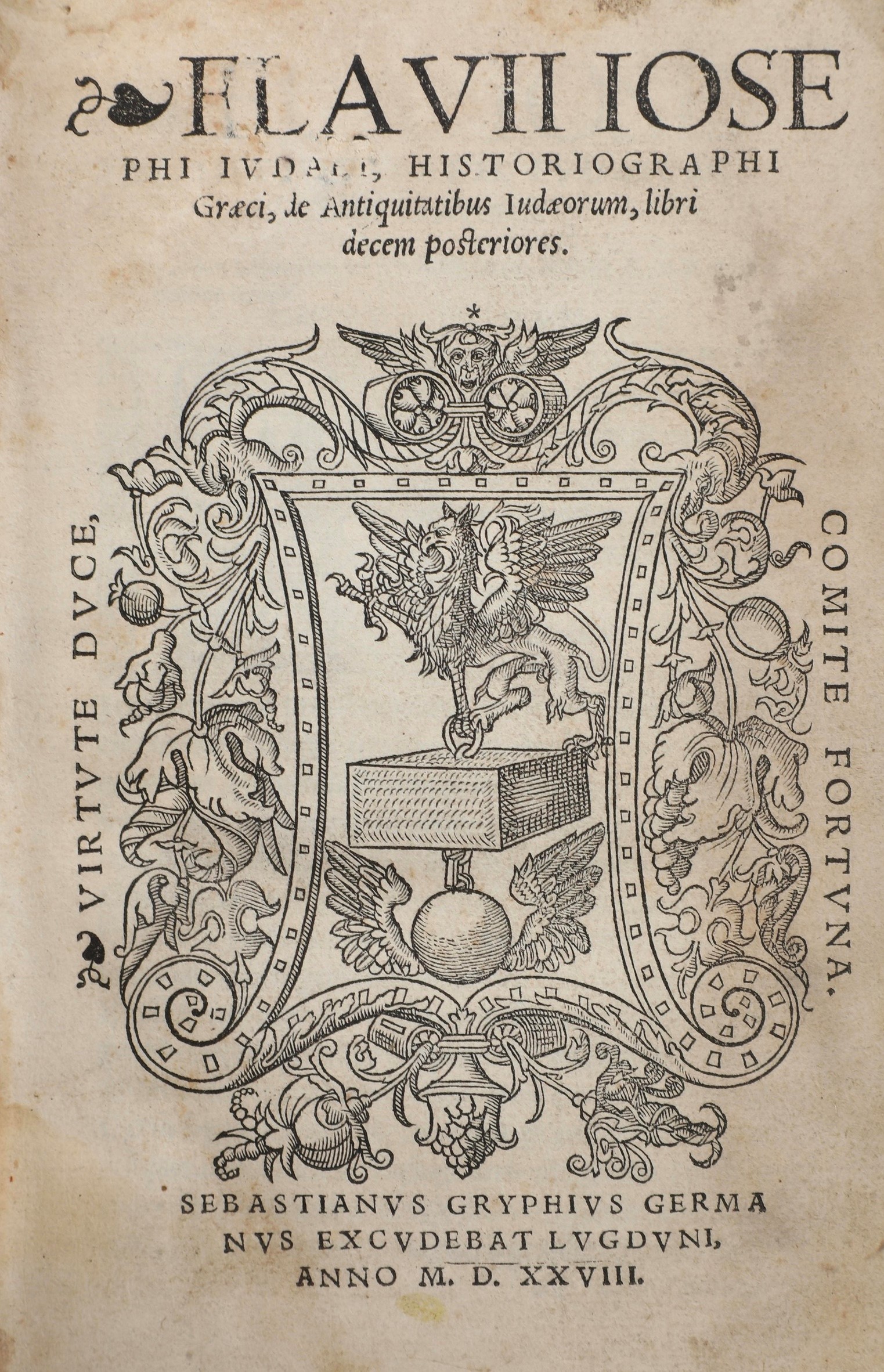 In-8°. Rilegatura in piena pergamena del secolo XVIII. Margine superiore un poco corto con perdita di qualche lettera alla tavola. Restauro al piede del frontespizio. Si aggiungono nel lotto: Plutarchi Chaeronensis Opuscola... Henr. Stephanus, (Paris), 1572. Rilegatura coeva in pergamena floscia; Flavii Iosephi Iudaei Hostoriographi, Opera, Gryphius, Lione, 1528; Flavii Iosephi Iudaei Hostoriographi, De antiquitatibus iudaeorum... Gryphius, Lione, 1528