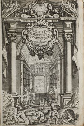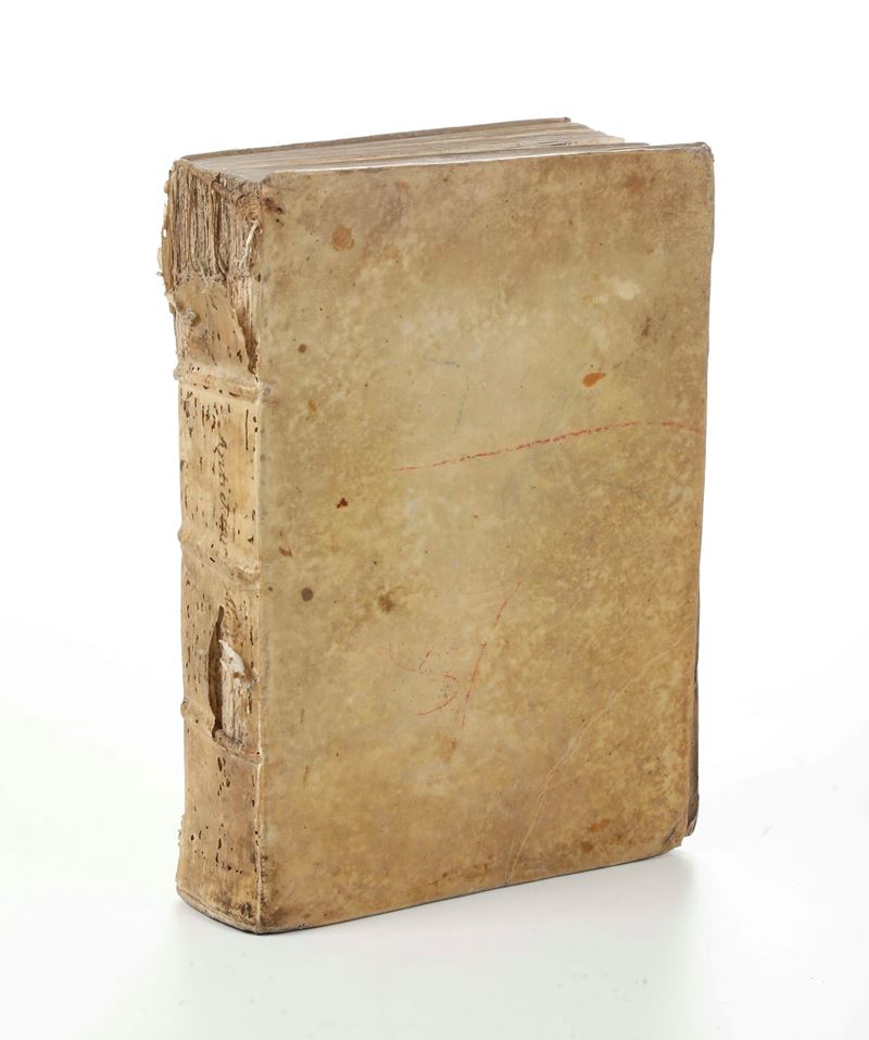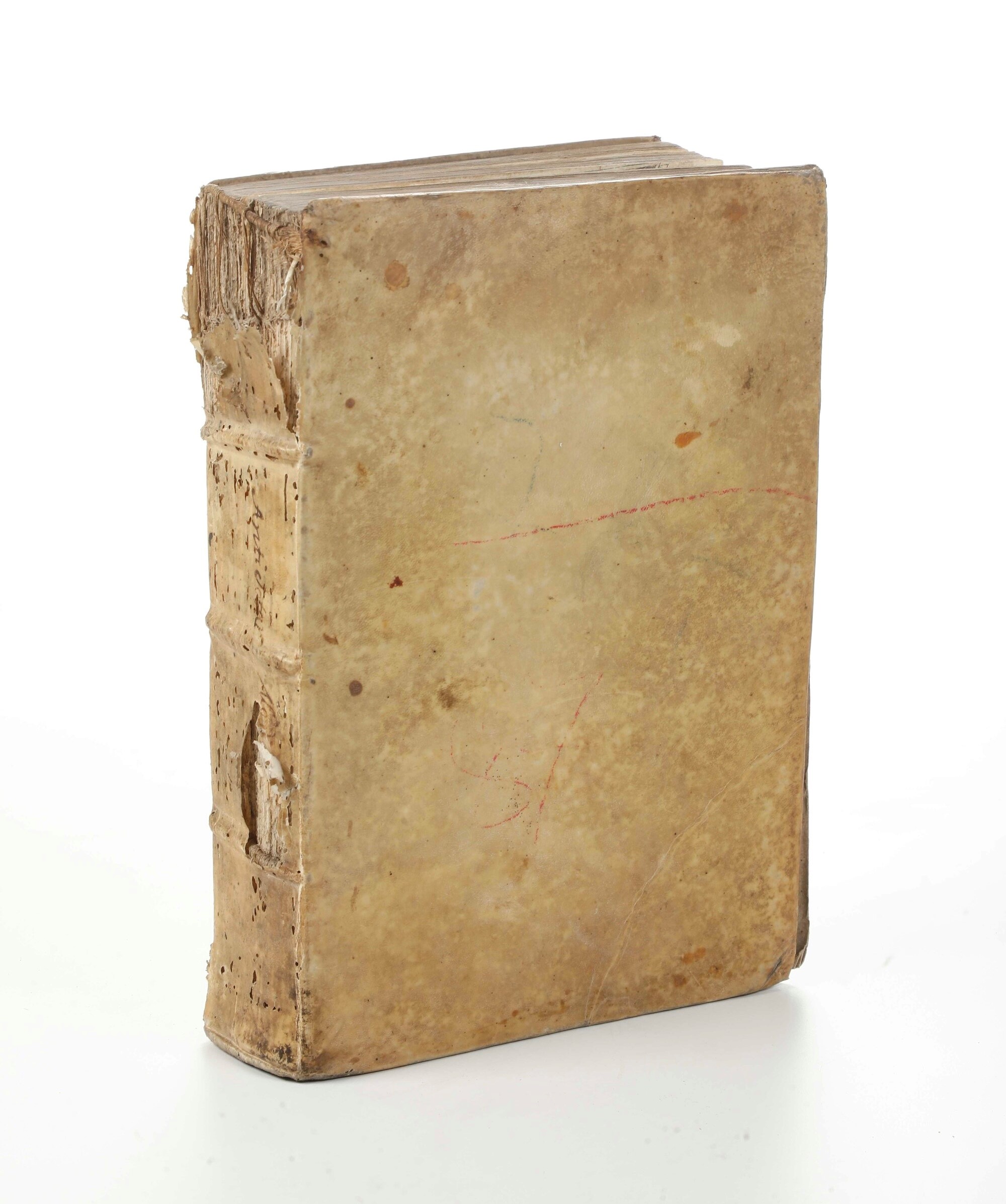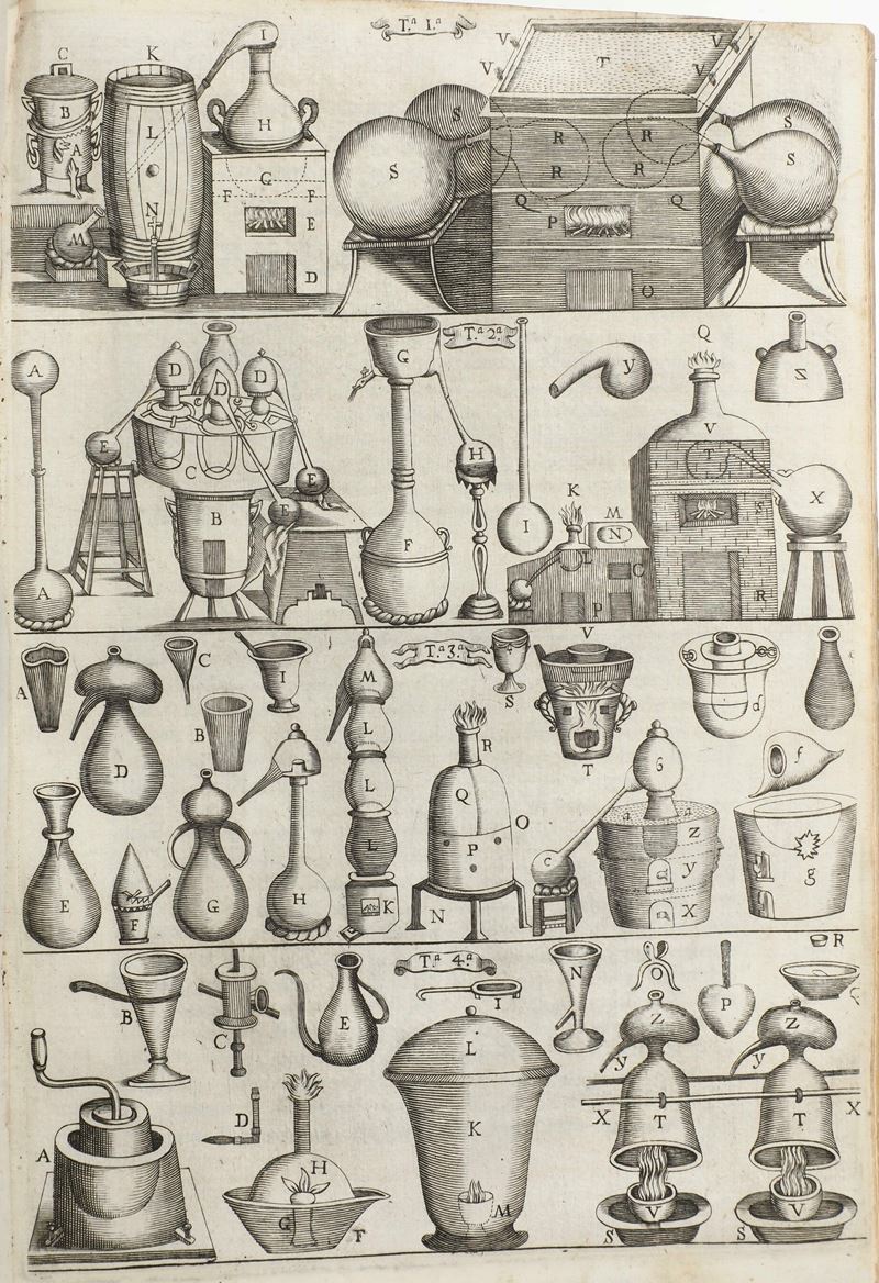 In-folio. Rilegatura coeva in pergamena rigida che presenta mancanze al dorso. tre parti rilegate insieme. Buon esemplare genuino, doppio frontespizio alla prima parte, il primo dei due calcografico e un'incisione raffigurante alambicchi