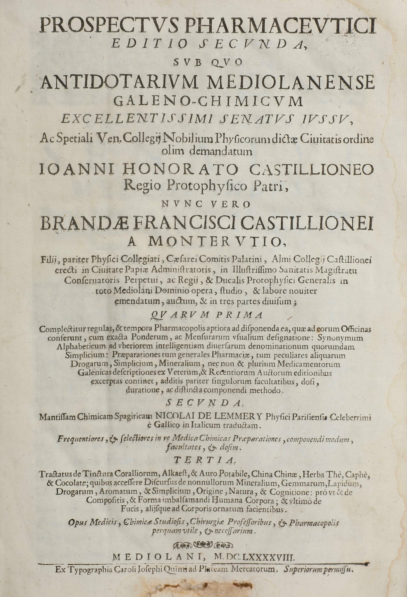 Castiglione Giovanni Onorato - Castiglione Branda Francesco Prospectus pharmaceutici antidotarium mediolanense galeno chimicum..Mediolani, ex tipografia caroli di Josephi quinti, 1698