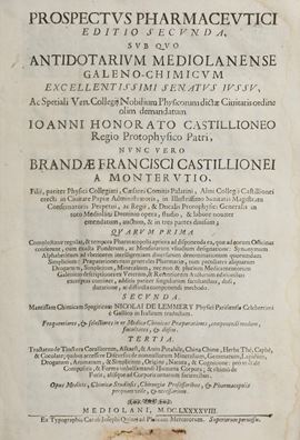 Castiglione Giovanni Onorato - Castiglione Branda Francesco Prospectus pharmaceutici antidotarium mediolanense galeno chimicum..Mediolani, [..]