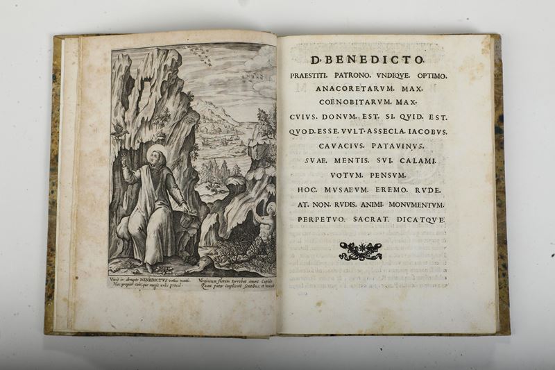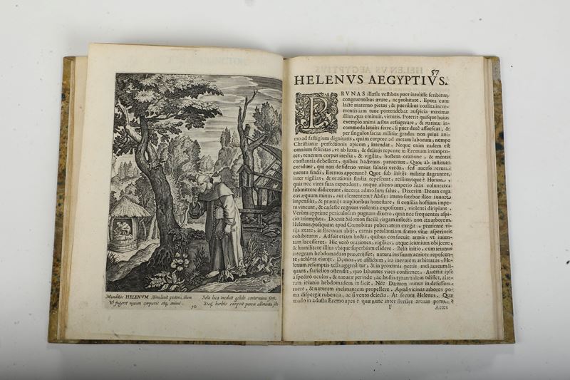 In-4°. Rilegatura in mezza pergamena del secolo XIX. Bella edizione illustrata da tavole raffiguranti anacoreti e monaci della chiesa delle origini