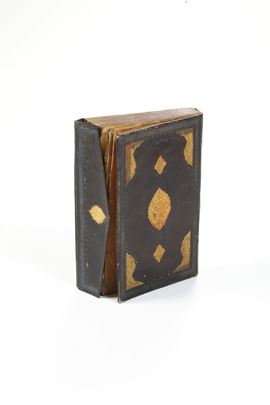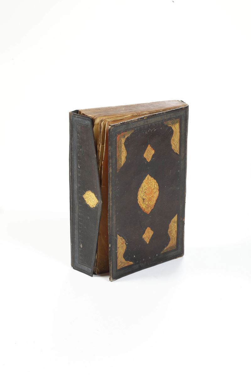 In-4°. (mm 175x113). Legatura coeva riccamente decorata con impressioni in oro nel campo centrale e agli angoli. Specchio di scrittura in inchiostro nero, frontespizio miniato con ampie cornici concentriche con motivi fitomorfi a colori: rosso, verde, celeste, giallo.