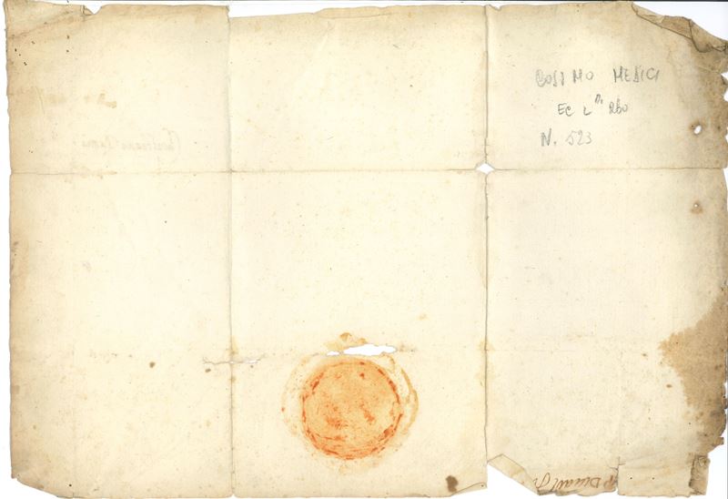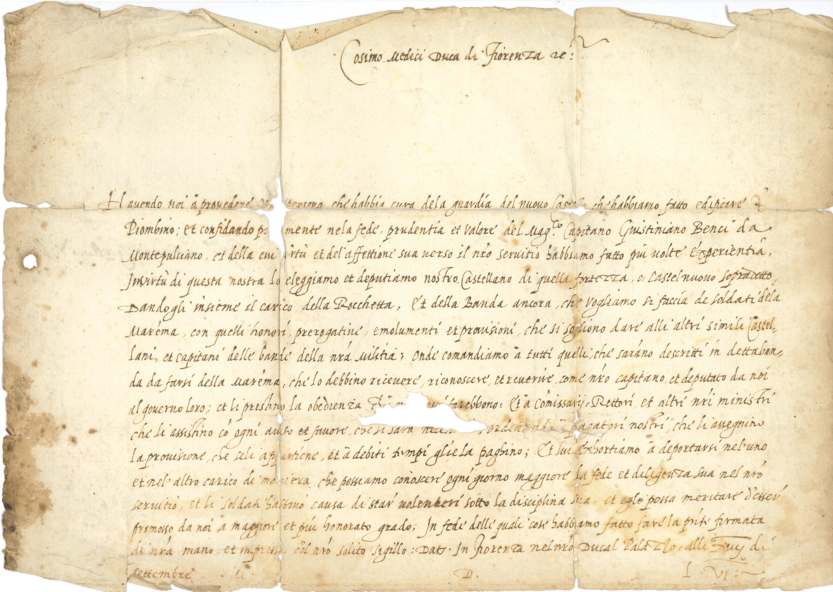 De' Medici Cosimo I, I granduca di Firenze (1519-1574) Decreto di nomina indirizzata al capitano Giustiniano Benci da Montepulciano come Castellano di Piombino