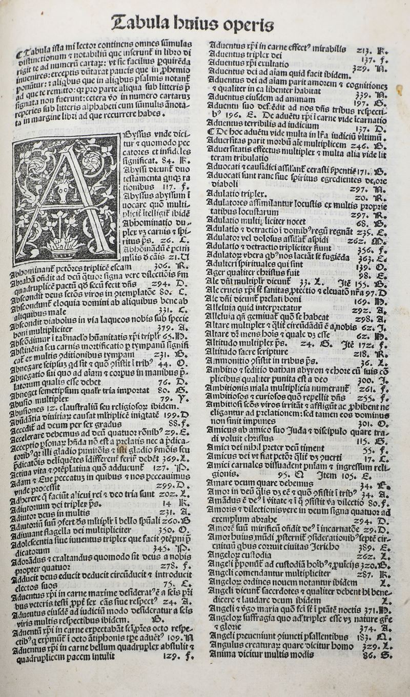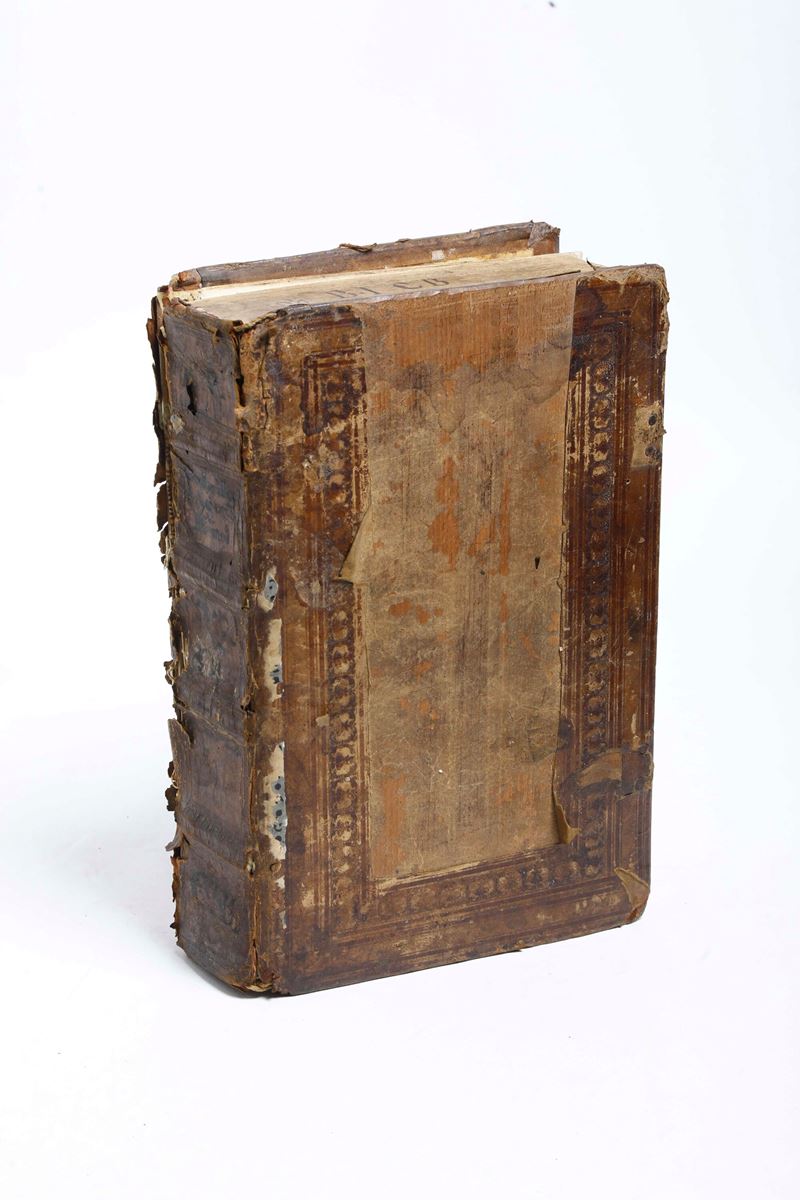 In-folio. (mm 327x216). [16] (di cui l'ultima bianca) + [1]+388 cc. (da 2 a 389, ultima bianca mancante). Rilegatura in pelle in stile monastico coeva, ex libris nobiliare al contropiatto (mancanza di porzioni di pelle asportate, rotture alle cuffie, legatura allentata). Testo su due colonne con pregevoli iniziali xilografiche. Esemplare fresco e marginoso.