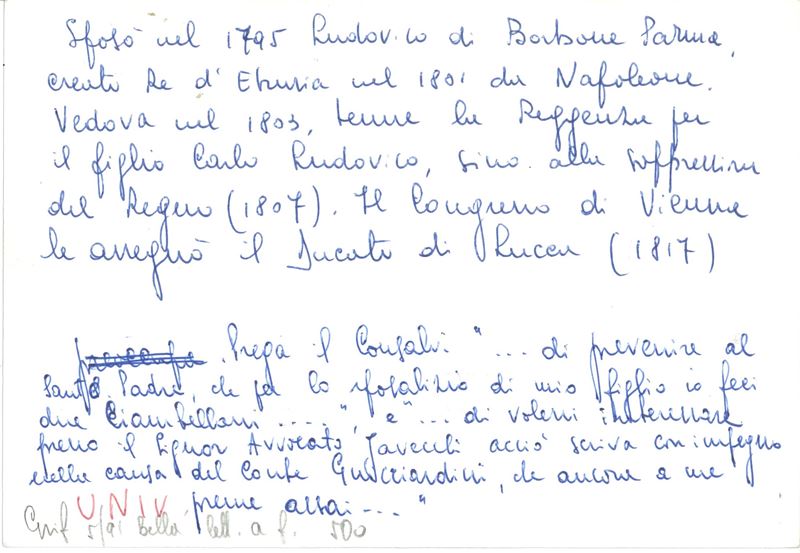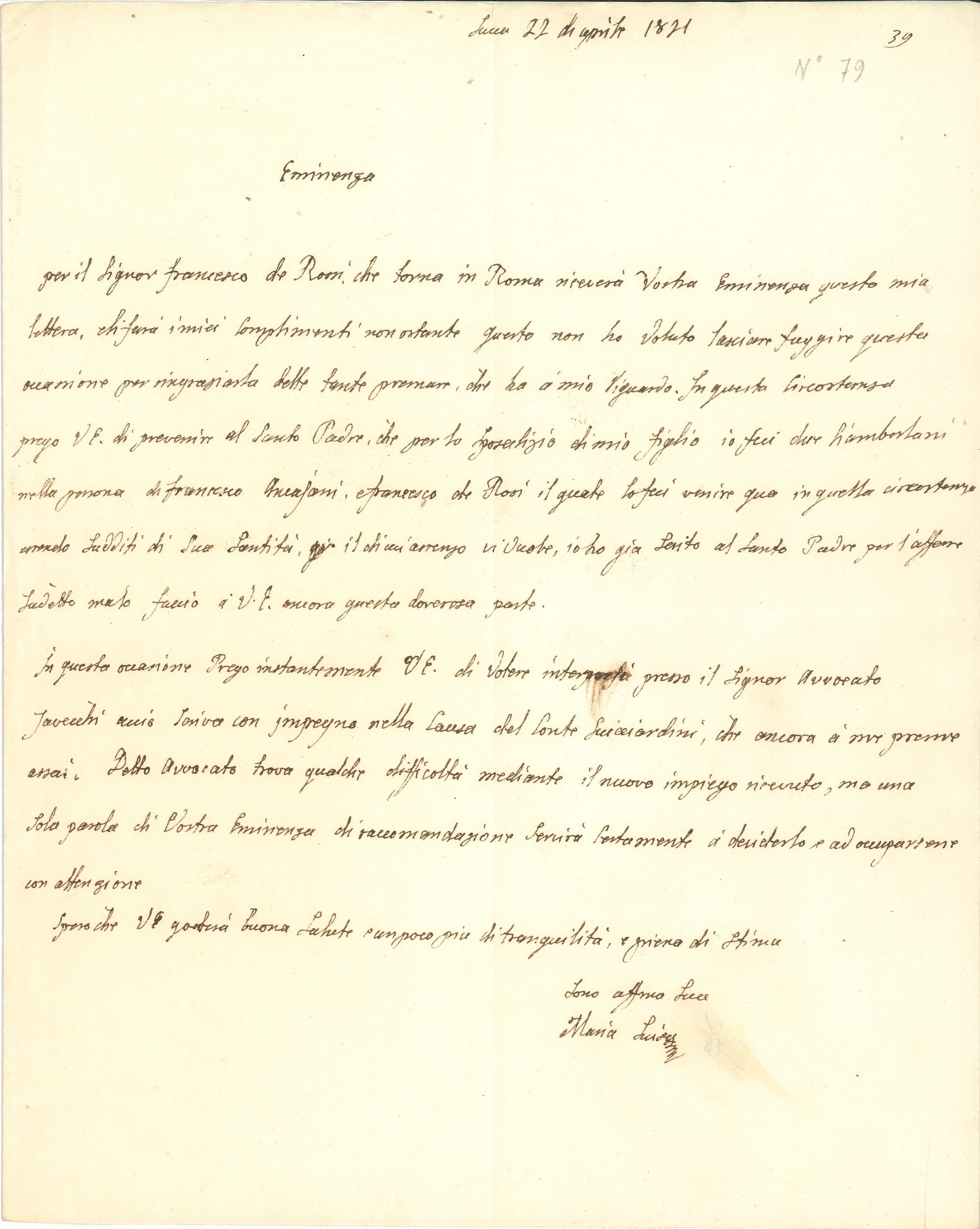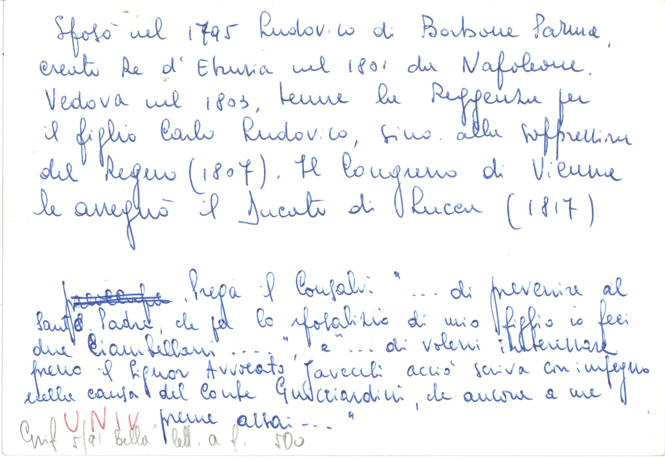 Di Borboni Maria Luisa (1782-1824) Lettera autografa indirizzata a "Sua Eminenza il signor Cardinale Ercole Consalvi segretario di Stato di Sua Santità”.
