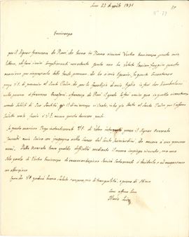 Lettera datata 02-04-1821. Foglio piegato in due con lettera scritta sulla prima pagina. Ringraziamento per favori precedenti e richiesta di intercessione per l'avvocato Javecchi. Presente la busta