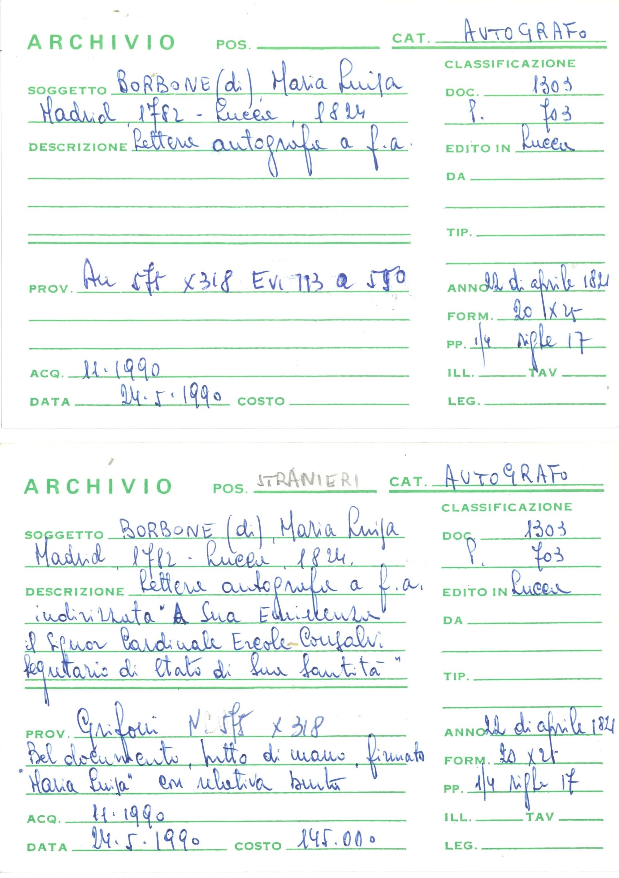 Di Borboni Maria Luisa (1782-1824) Lettera autografa indirizzata a "Sua Eminenza il signor Cardinale Ercole Consalvi segretario [..]