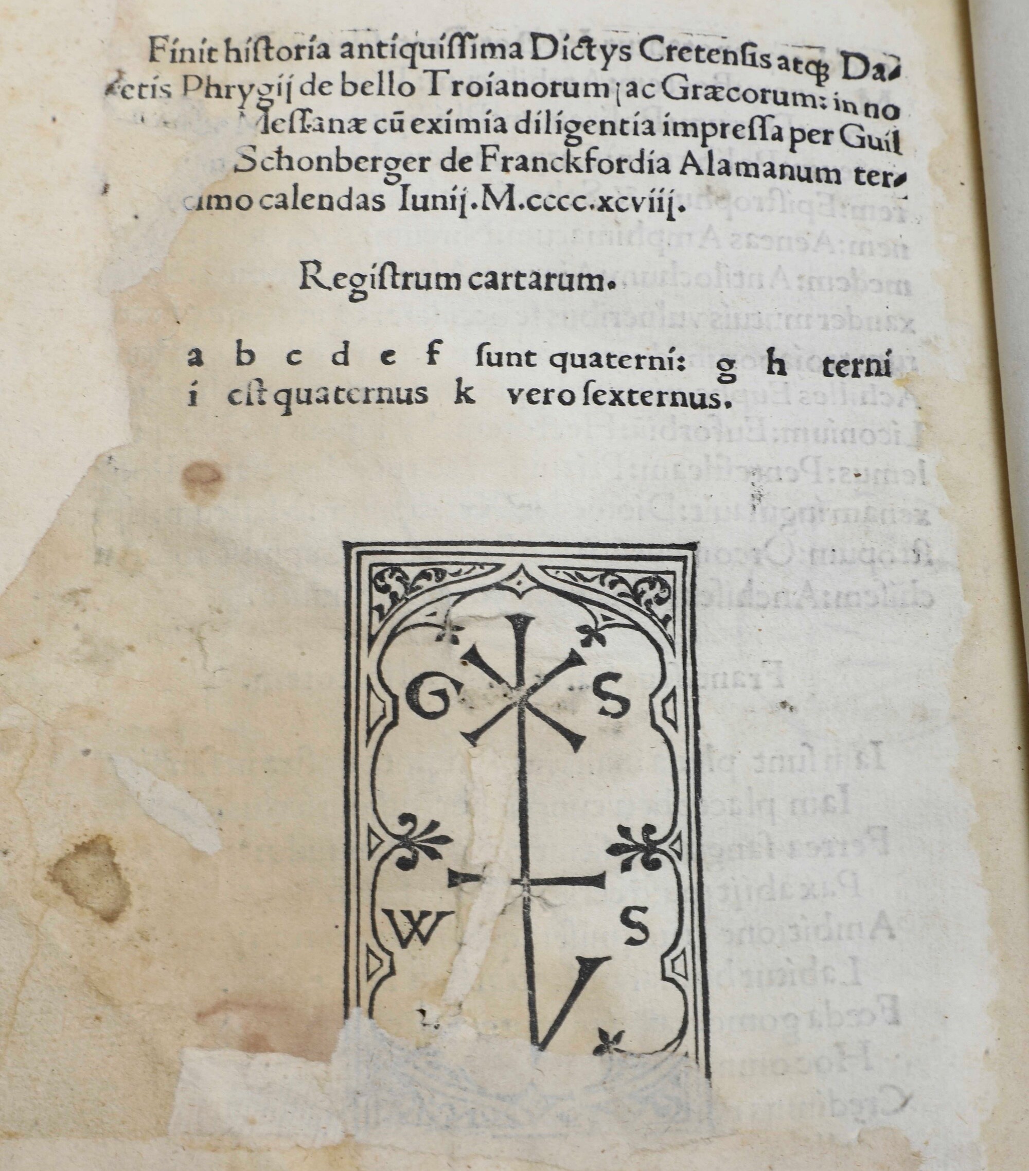 Dictys cretensis de historia belli Troiani et Dares Phrygius de eadem historia troiana Guilhem Shonberger de Frankfordia, [..]