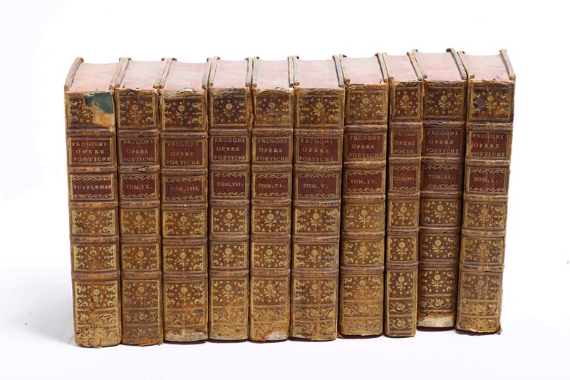 10 voll. in-4° (cm 20,8x14,5). I volume e supplemento con bell'antiporta incisa col busto dell'autore coronato d'alloro, alcuni finalini decorativi. Legature in piena pelle, dorso decorato con oro impresso, doppio tassello con indicazione di autore, titolo e numero di tomo (usure e piccole mancanze). Esemplari marginosi e per lo più freschi, alcune con foxing.
