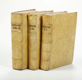 In-4°. (mm 243x178). 4 tomi rilegati in 3 volumi. Vol. I §(8 pp.) + 601 pp. num. (+1 p.); Vol. II (4 pp.) + 364 pp.; vol. III (4 pp.) + 486 pp.; vol. IV (8 pp.) + 442 pp. + (2 pp.).Rilegatura in piena pergamena coeva, tagli marmorizzati.