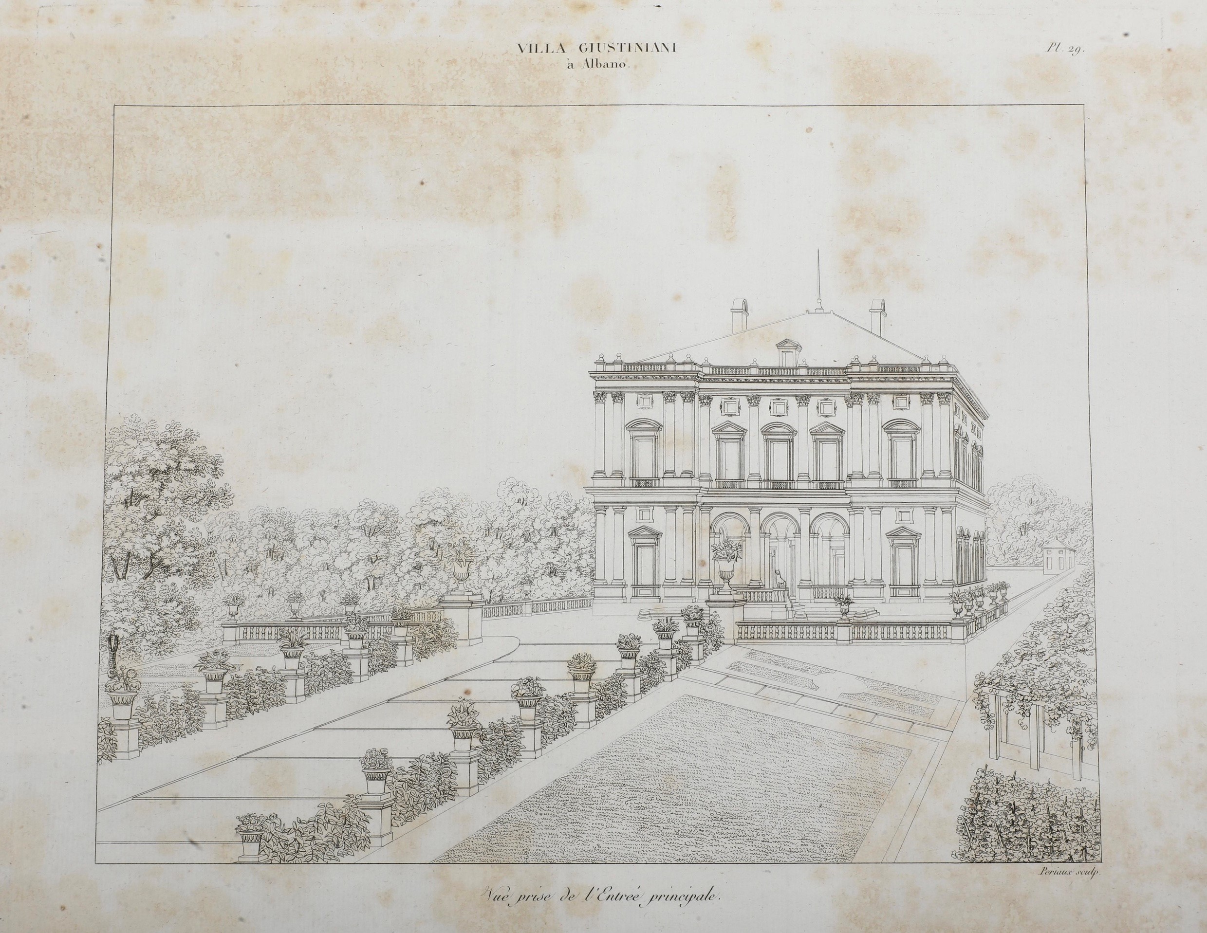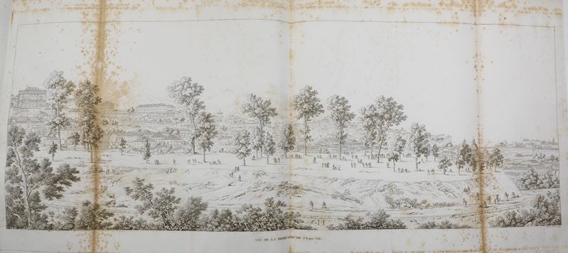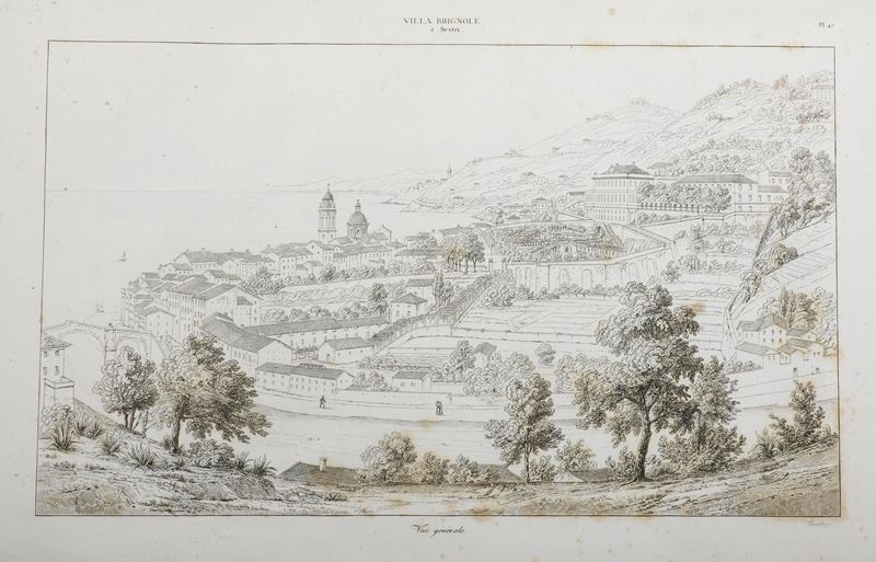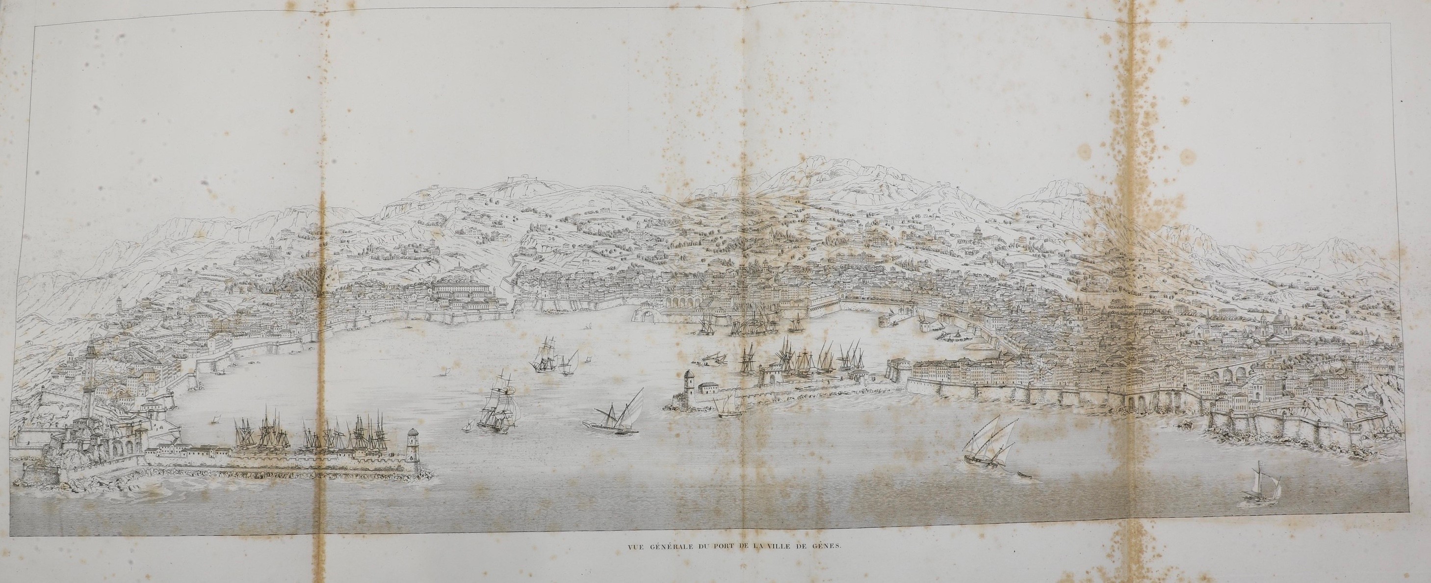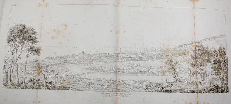In folio atlantico (mm 496x335). Rilegatura ottocentesca in mezza pelle e angoli. Vol I 102 tavv. a tutta pagina inframmezzate da 6 vedute di Genova, per lo più a doppia pagina; vol. 2 72 tavv. a tutta pagina. Foxing nelle carte di testo e in diverse tavole, per lo più localizzato nei margini.