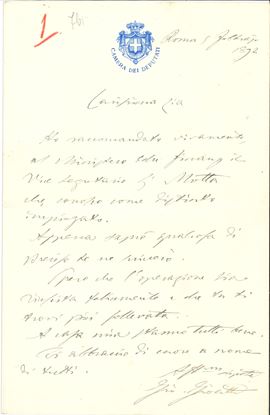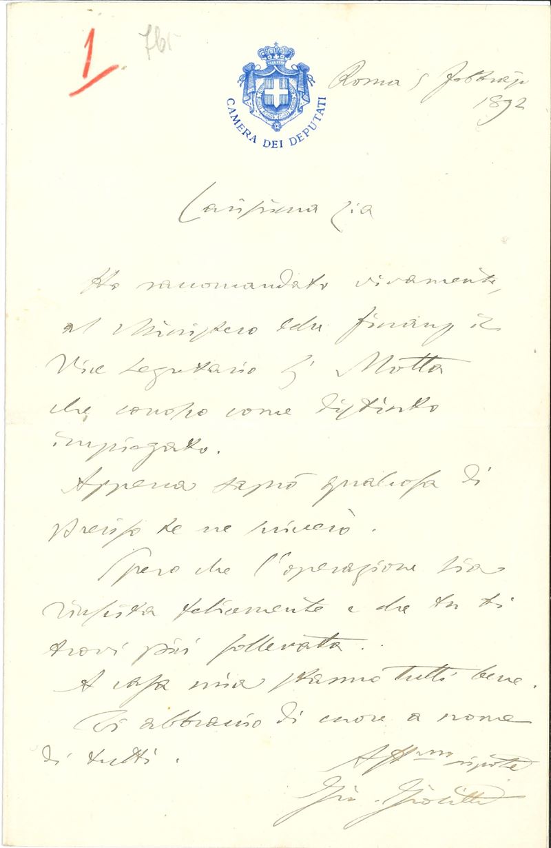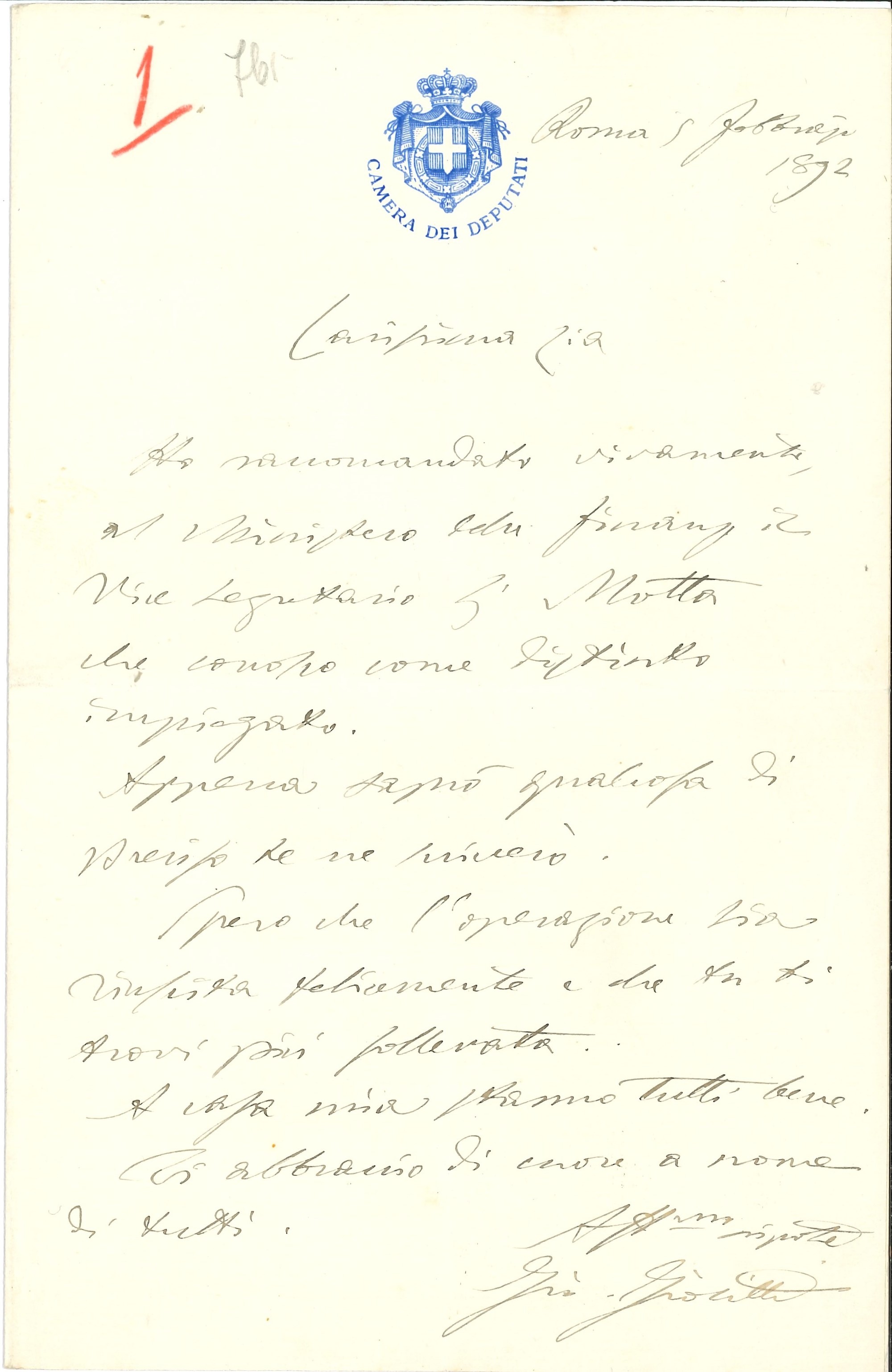 Documento su carta intestata della Camera dei deputati, datato Roma, 1892. Breve messaggio (una facciata manoscritta) in cui lo statista piemontese tratta alcune questioni familiari