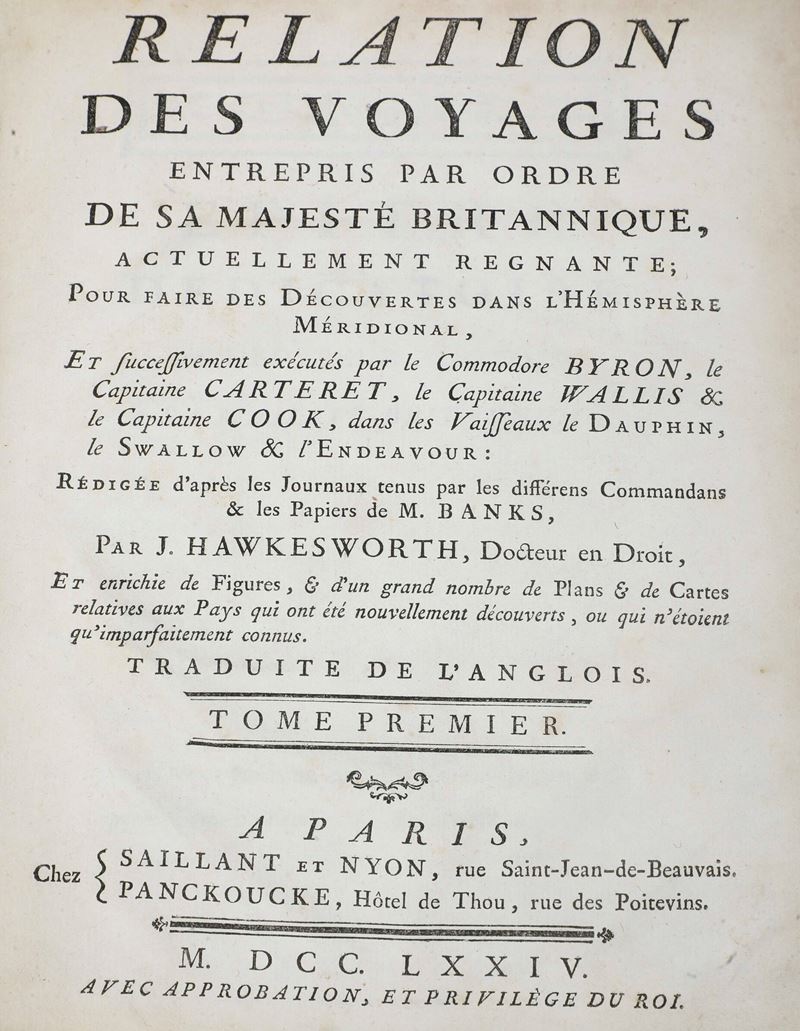 Hawkesoworth John (1715-1773) Relation Des Voyage.. A Paris, chez Saillant et Nyon, Panckoucke, 1774