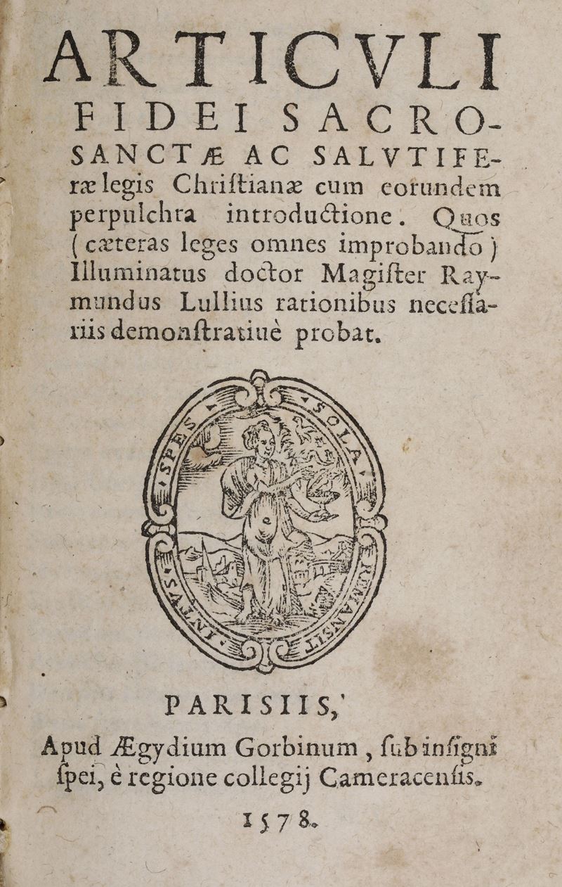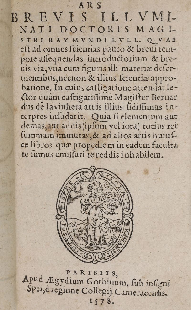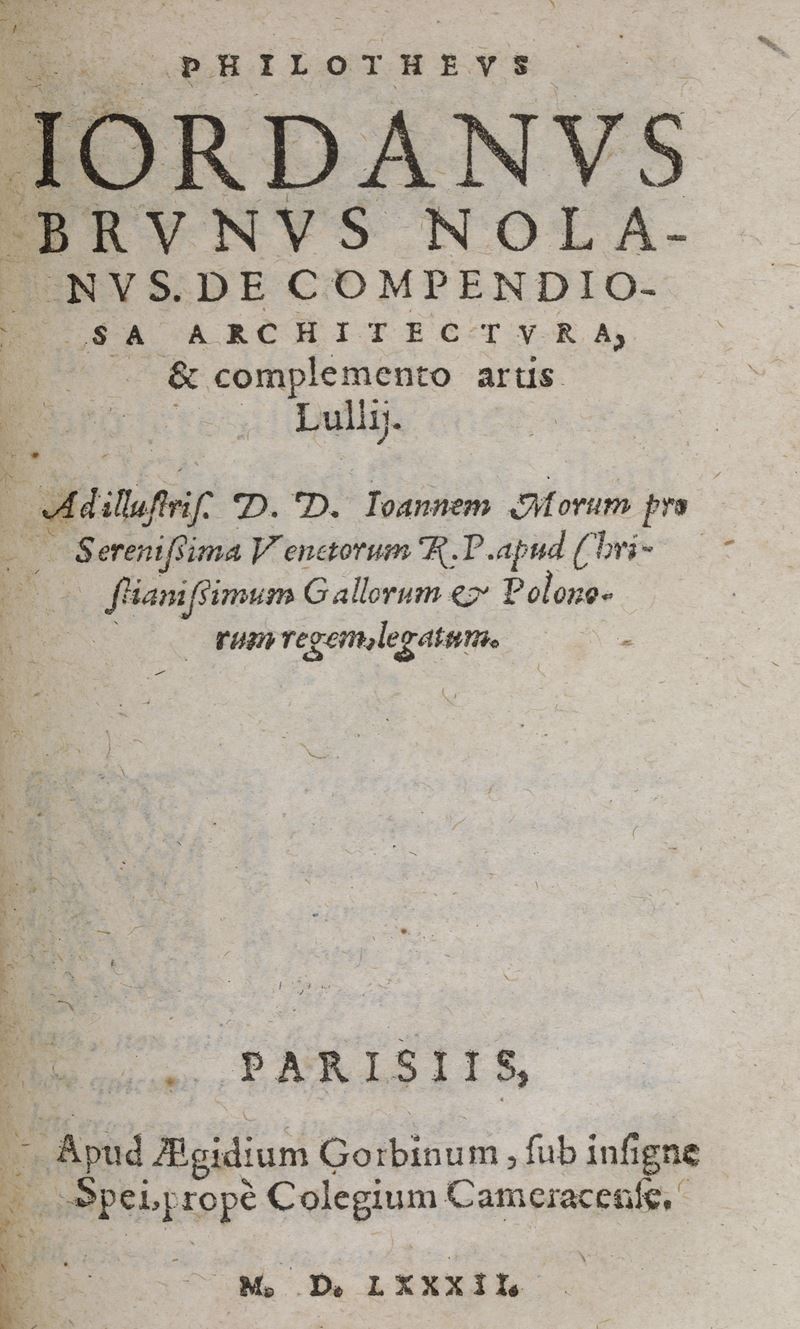 Opusculum Raymundinum de auditu Kabbalistico sive ad omnes scientias introductorium...Parisiis, apud Aegidium Gorbinum, 1578; Ars brevis illuminati doctoris magistri Raymundi Lull. quae est ad omens scientias...Parisiis, apud Aegidium Gorbinum, 1578; Articuli fidei sacrosante ac salutifera legis Christianae...Parisiis, apud Aegidium Gorbinum, 1578; Philotheus Iordanus Brunus Nolanus. De compendiosa architectura, & complemento artis Lullij...Parisiis, apud Aegidium Gorbinum, 1582