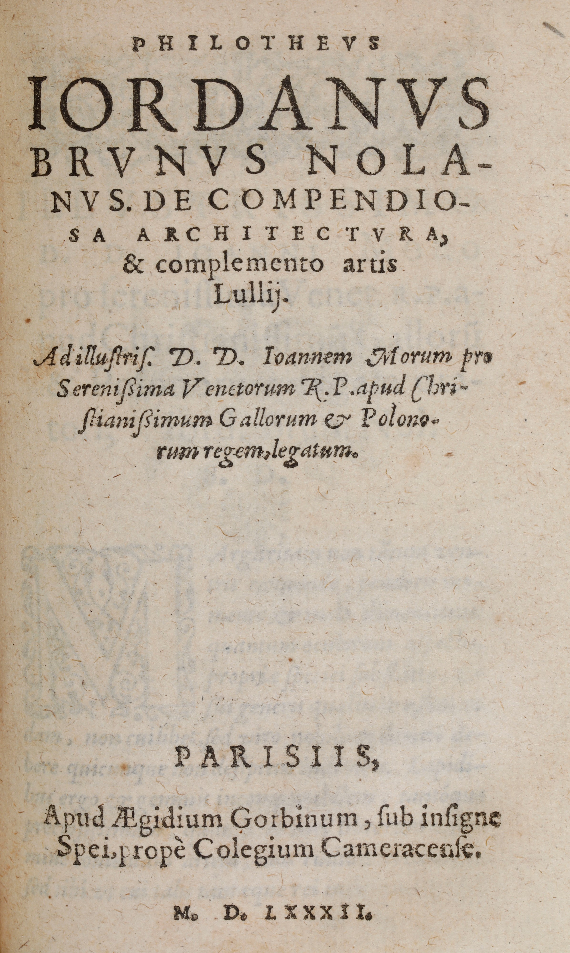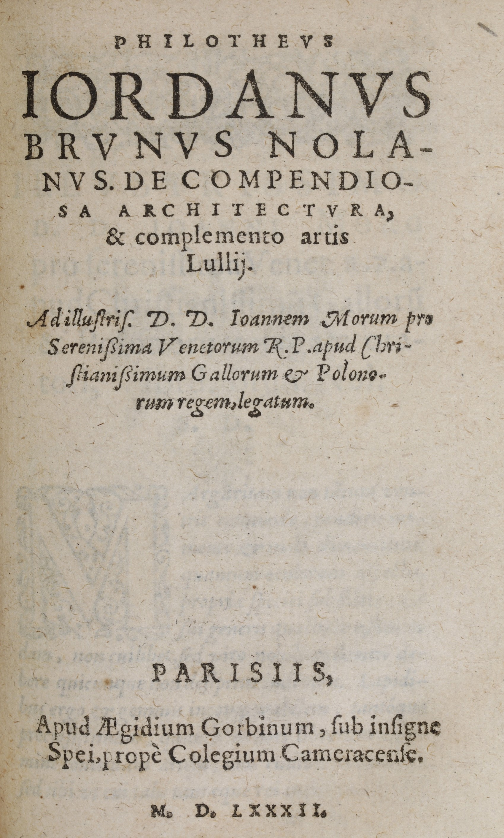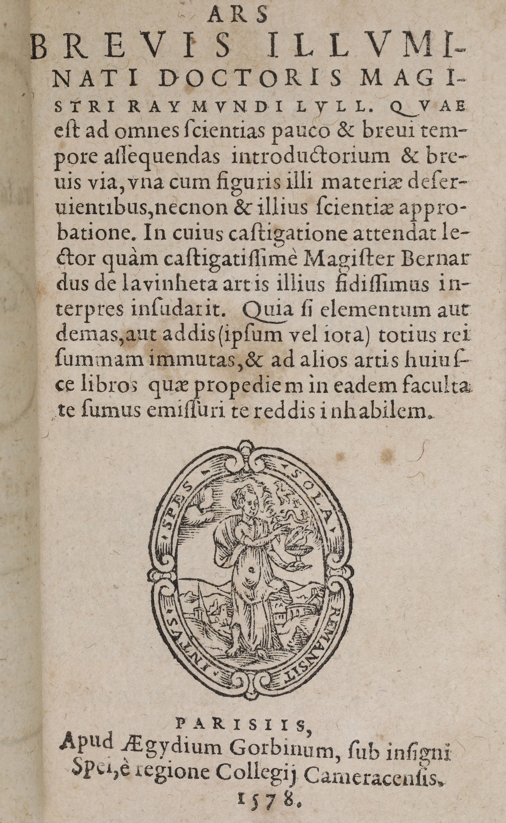 Opusculum Raymundinum de auditu Kabbalistico sive ad omnes scientias introductorium...Parisiis, apud Aegidium Gorbinum, 1578; Ars brevis illuminati doctoris magistri Raymundi Lull. quae est ad omens scientias...Parisiis, apud Aegidium Gorbinum, 1578; Articuli fidei sacrosante ac salutifera legis Christianae...Parisiis, apud Aegidium Gorbinum, 1578; Philotheus Iordanus Brunus Nolanus. De compendiosa architectura, & complemento artis Lullij...Parisiis, apud Aegidium Gorbinum, 1582