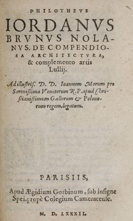 Bibliografia di riferimento: Silvestrini Virgilio, Bibliografia delle opere di Giordano Bruno e degli scritti ad esso attinenti, Pisa, Officine Arti Grafiche "Folchetto", 1926; Silvestrini Virgilio, Bibliografia di Giordano Bruno, II edizione postume, Firenze, Sansoni Antiquariato, 1958