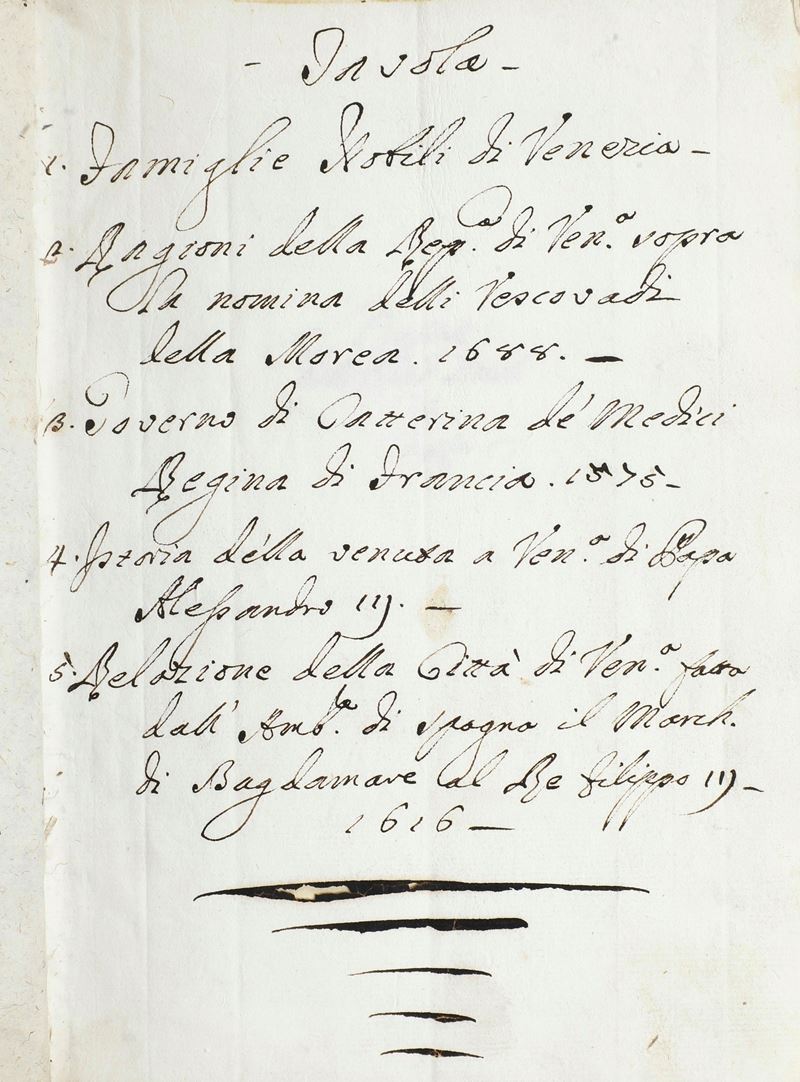 Manoscritto anonimo del secolo XVII Famiglie nobili di Venezia / Ragioni della Repubblica di venezia sopra la nomina dei Vescovadi della Marea, 1688 / Governo di Caterina de' Medici Regina di Francia, 1575 / Storia della venuta a Venezia del Papa Alessandro III / Relazione della città di Venezia fatta dall'ambasciatore di Spagna il March. di Begdamare al re Filippo III, 1616