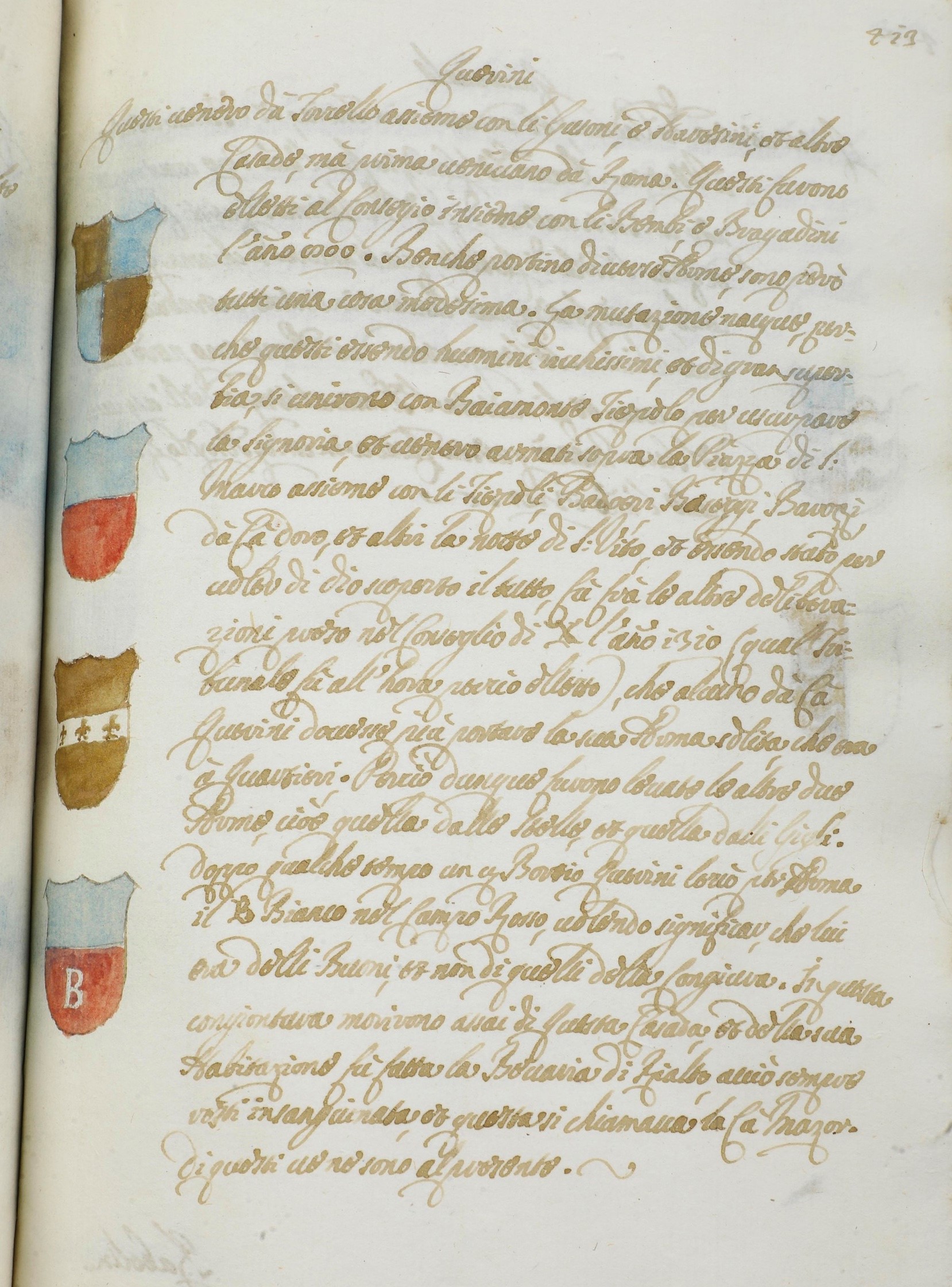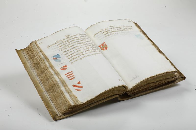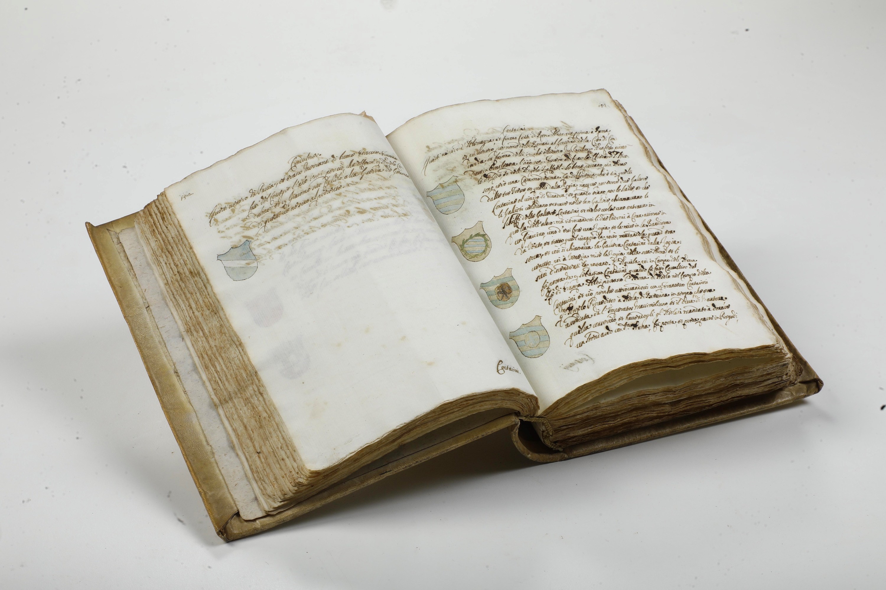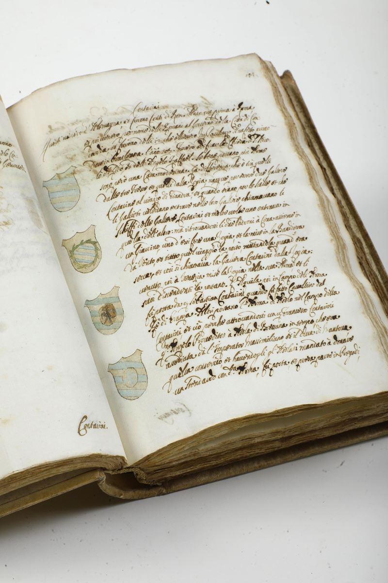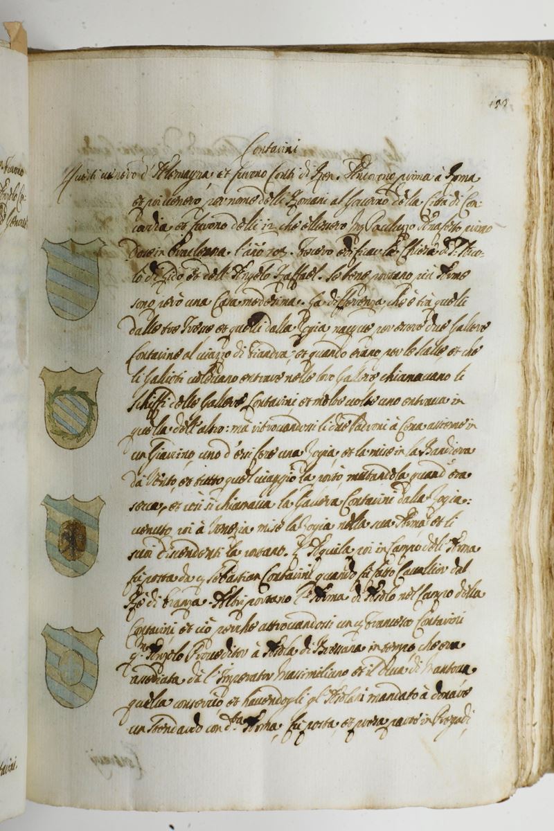 In-4°. (mm 212x147). Rilegatura in piena pergamena rigida del secolo XVIII. Manoscritto su carta vergellata arricchito, per la prima opera, dagli stemmi a colori delle famiglie veneziane. Esemplare fresco, senza bruniture
