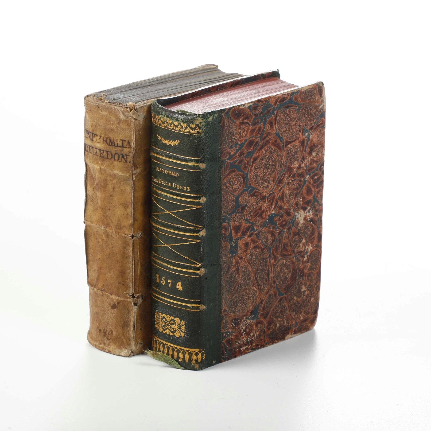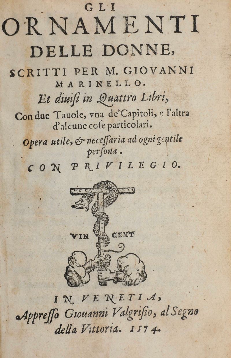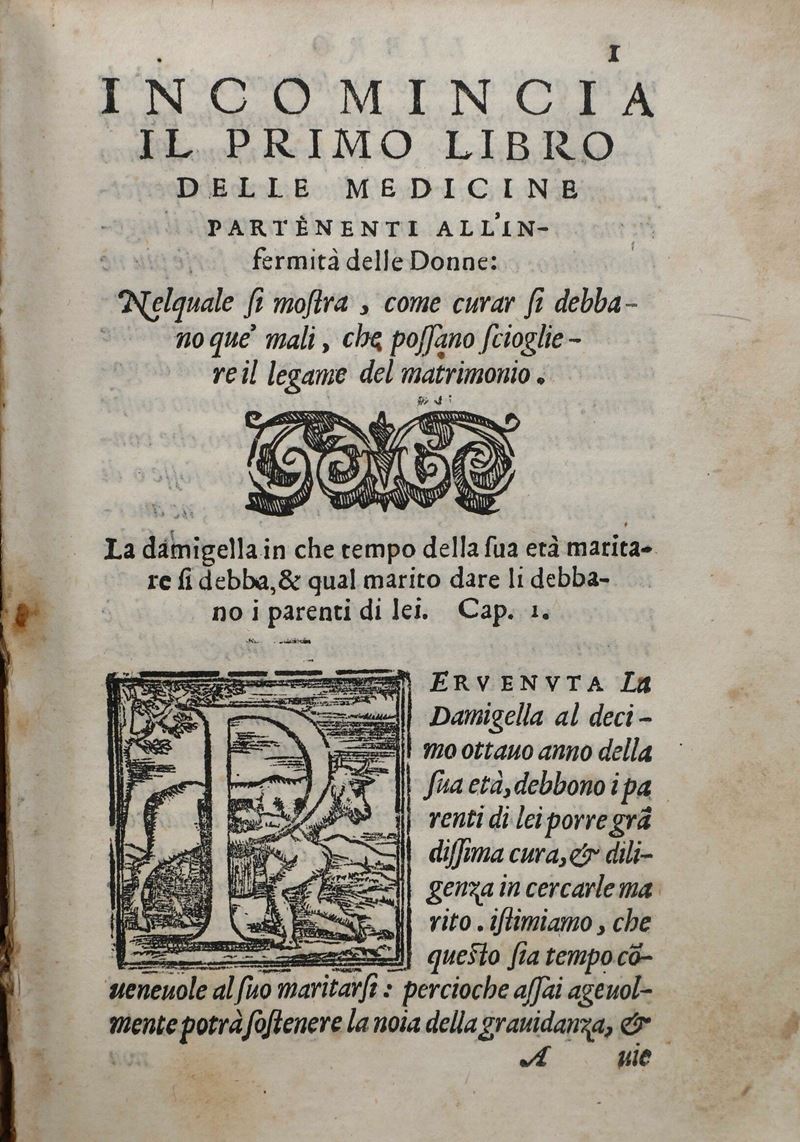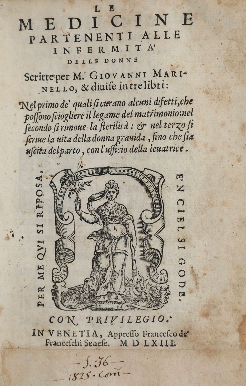 In-8°. Rilegatura in mezza pelle del secolo XIX. Esemplare discreto tuttavia non esente da bruniture e macchie. Taglio superiore un po’ corto. Manca l’ultima carta bianca. Si aggiunge al lotto: Giovanni Marinello, le medicine pertenenti alle infermità delle donne, in Venezia, appresso Francesco de Franceschi Senese, 1563. Bell’esemplare rilegato in piena pergamena floscia coeva, mancanza al piede del frontespizio integrata anticamente. Un paio di fascicoli parzialmente staccati