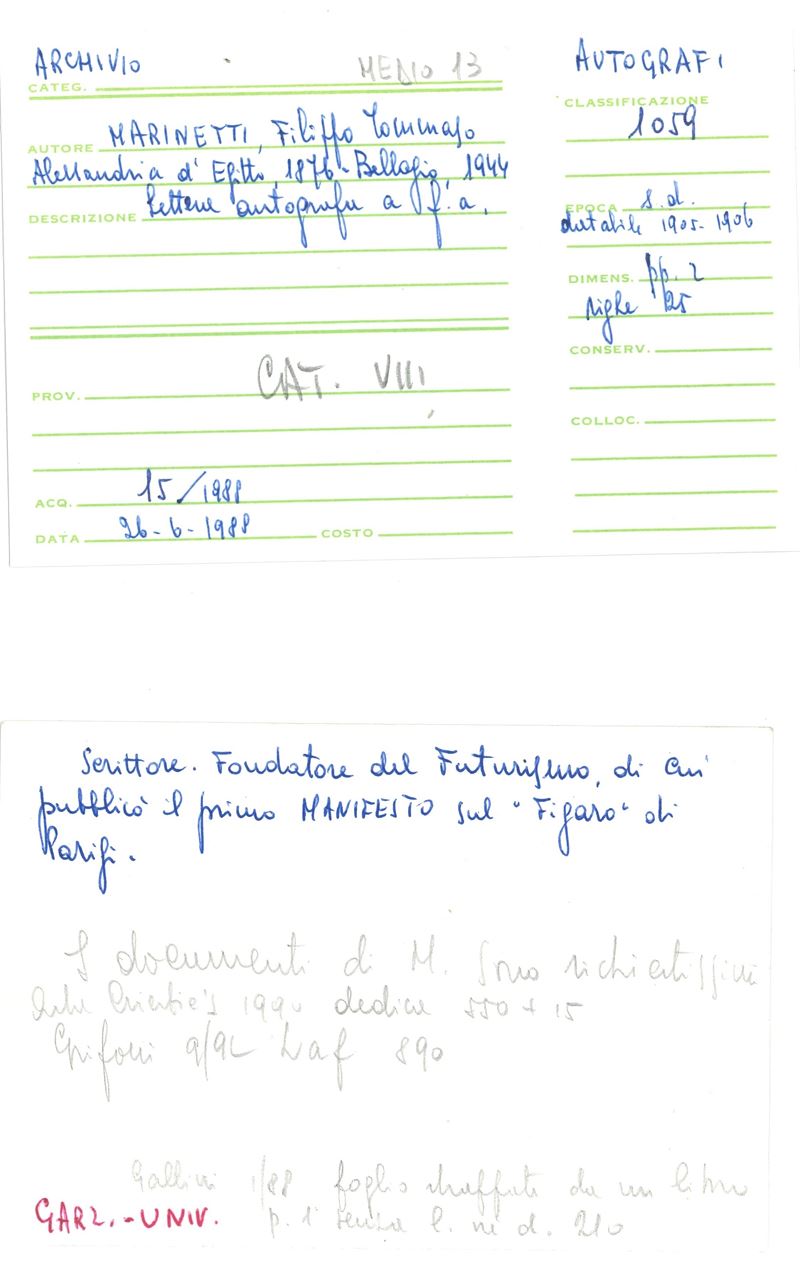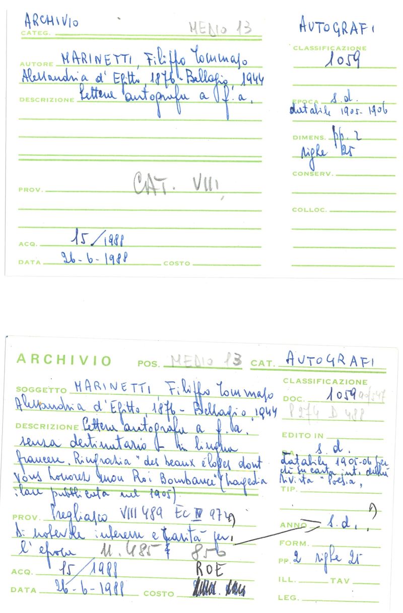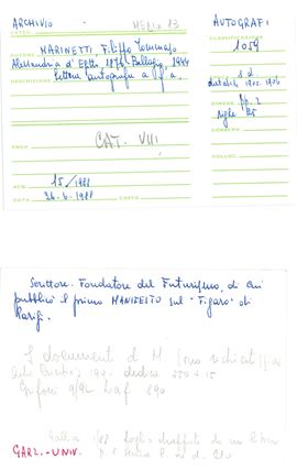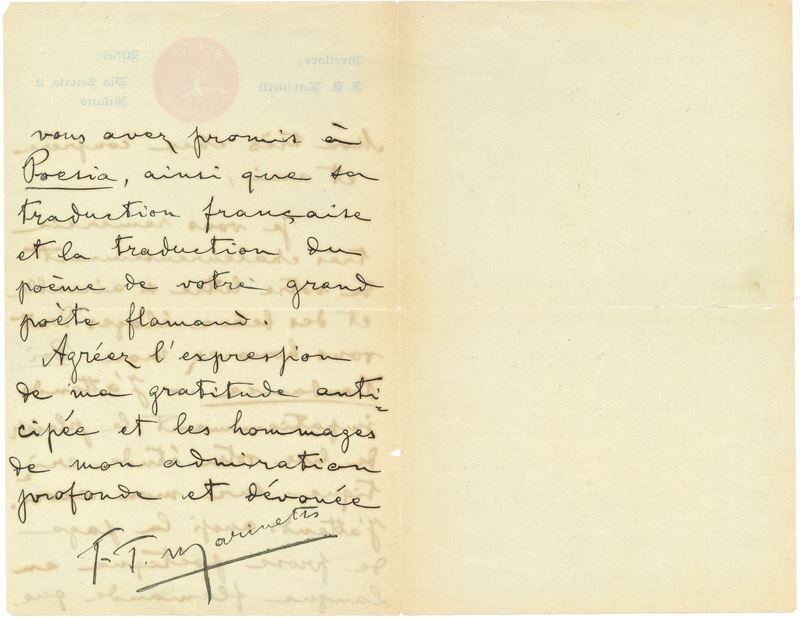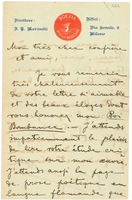 Marinetti Filippo Tommaso (1876 - 1944) Lettera autografa in francese a un "cher confrére et ami"