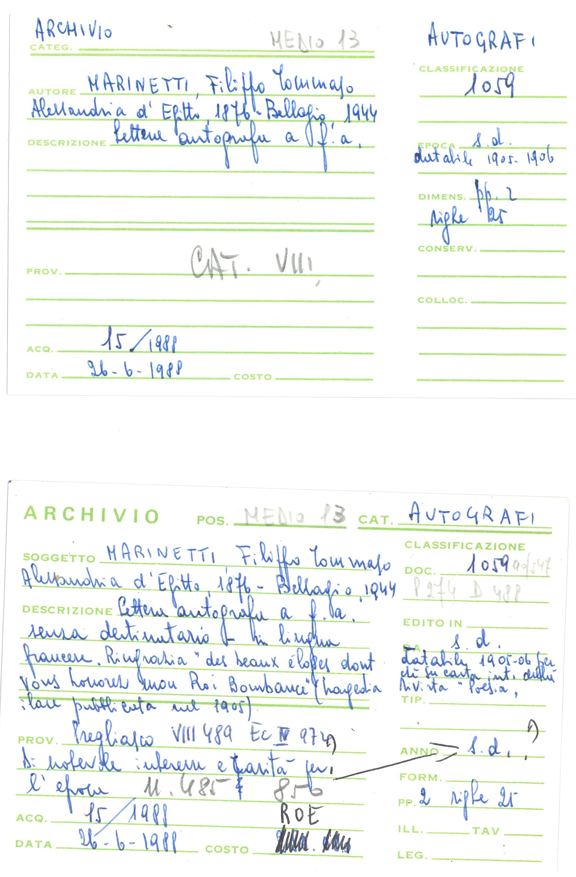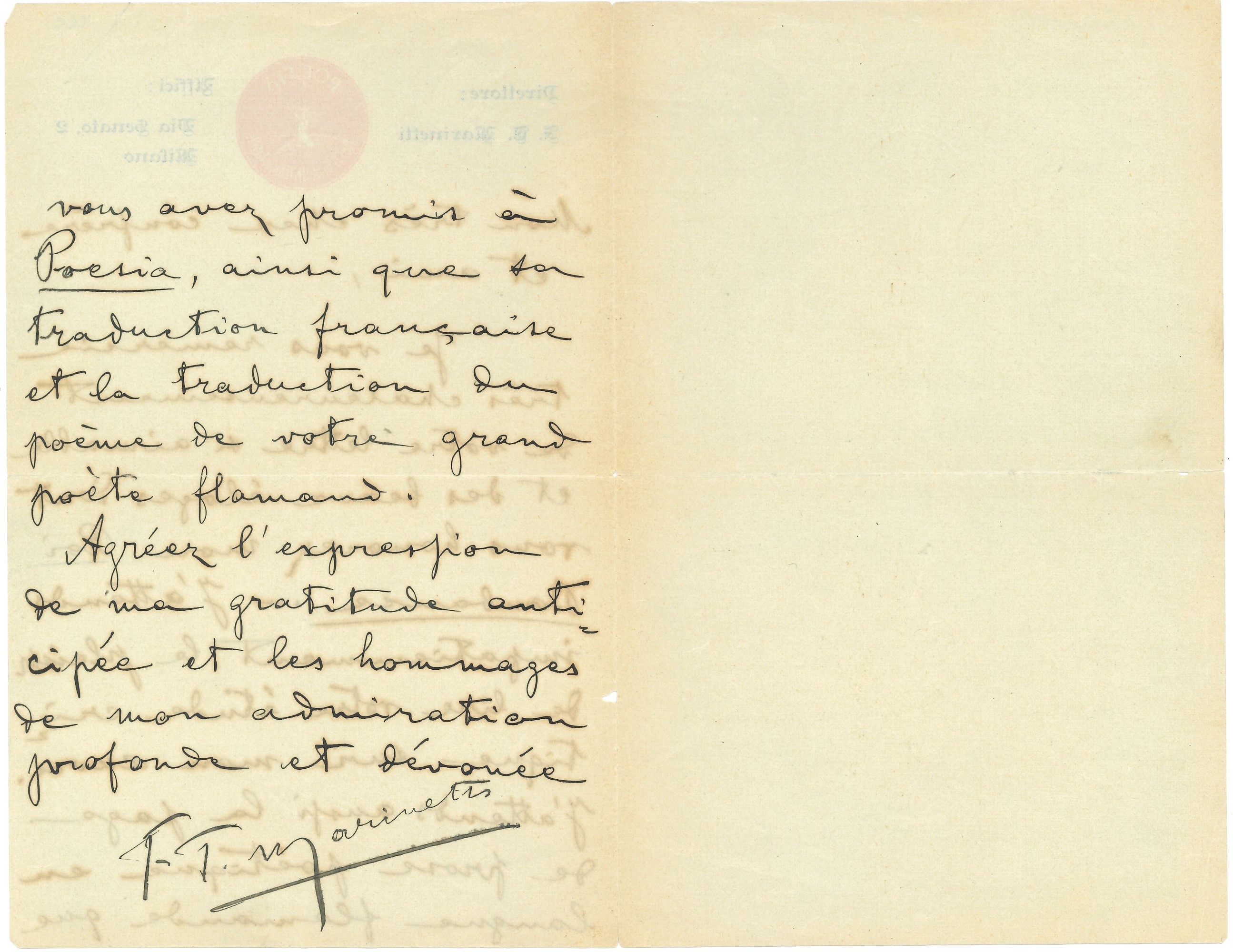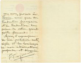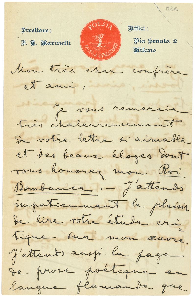 Due facciate manoscritte su carta intestata del direttore della rassegna internazionale di poesia. Il poeta ringrazia un critico per gli elogi ricevuti per la tragedia "Le Roi Bombance", elemento che rende la lettera databile tra il 1905 e il 1906