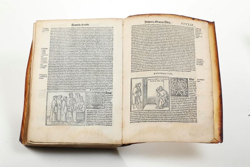 In-folio. (302x210). Rilegatura coeva in pergamena floscia (parzialmente staccata, alcune macchie), ex libris nobiliare al contropiatto. Belle illustrazioni e iniziali xilografiche nel testo. Esemplare fresco, con qualche gora e macchia concentrate nei margini esterni.