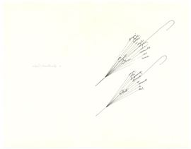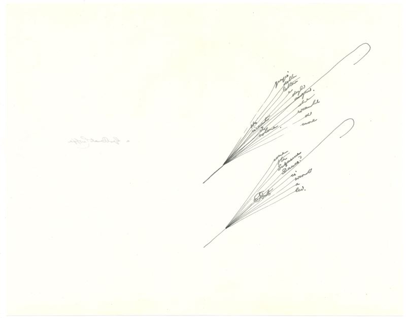 Una facciata con disegno e manoscritto firmato "Ponti" e una con dedica. Bozza di parole figurate con ombrellini