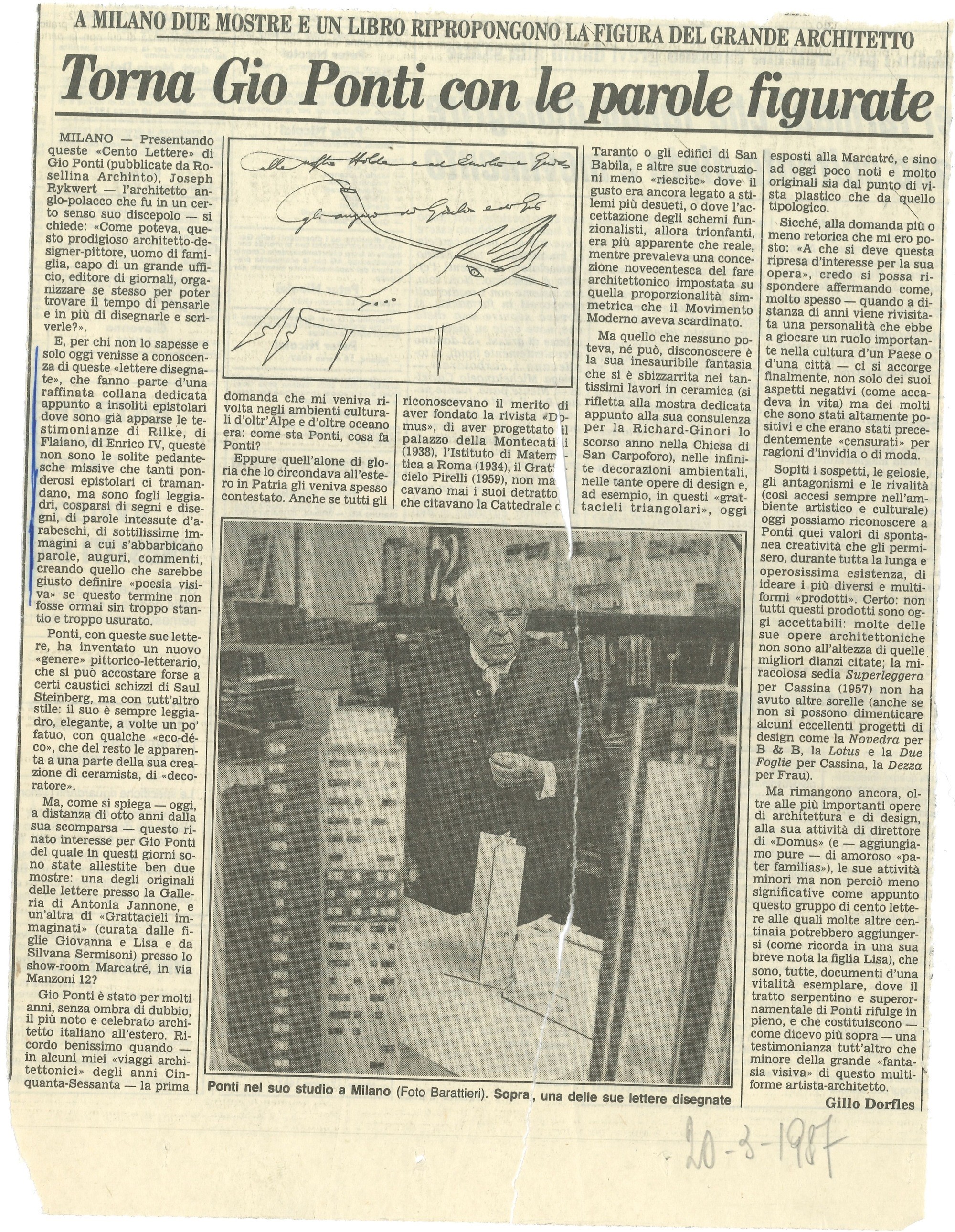Ponti Giovanni, detto Gio (1891-1979) Bozza autografa a Geo Renato Crippa