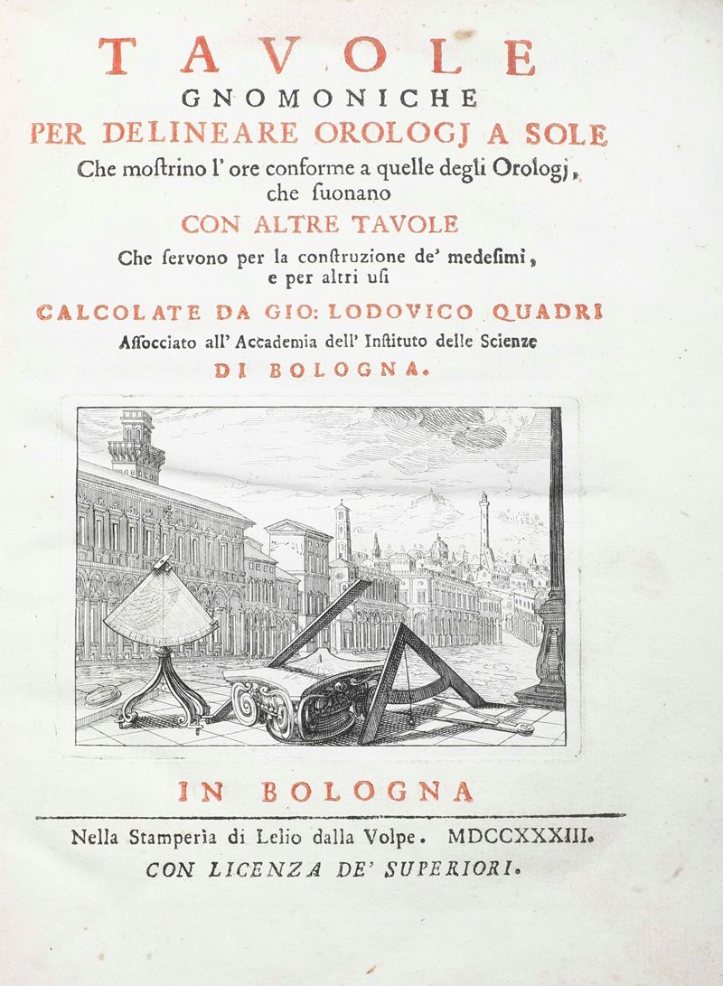 Quadri Giò Lodovico Tavole gnomoniche per delineare orologi a sole che mostrino l'ora confromi a quelli degli orologi che suonano, 1733