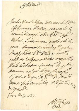 Documento datato Pisa, 2-03-1666. Una facciata manoscritta e una con indicazione del destinatario. Si tratta presumibilmente di un messaggio che accompagnava una relazione sullo stato di Mattias de' Medici ai suoi parenti. Alcuni fori generati dall'ossidazione dell'inchiostro, per il resto buon esemplare
