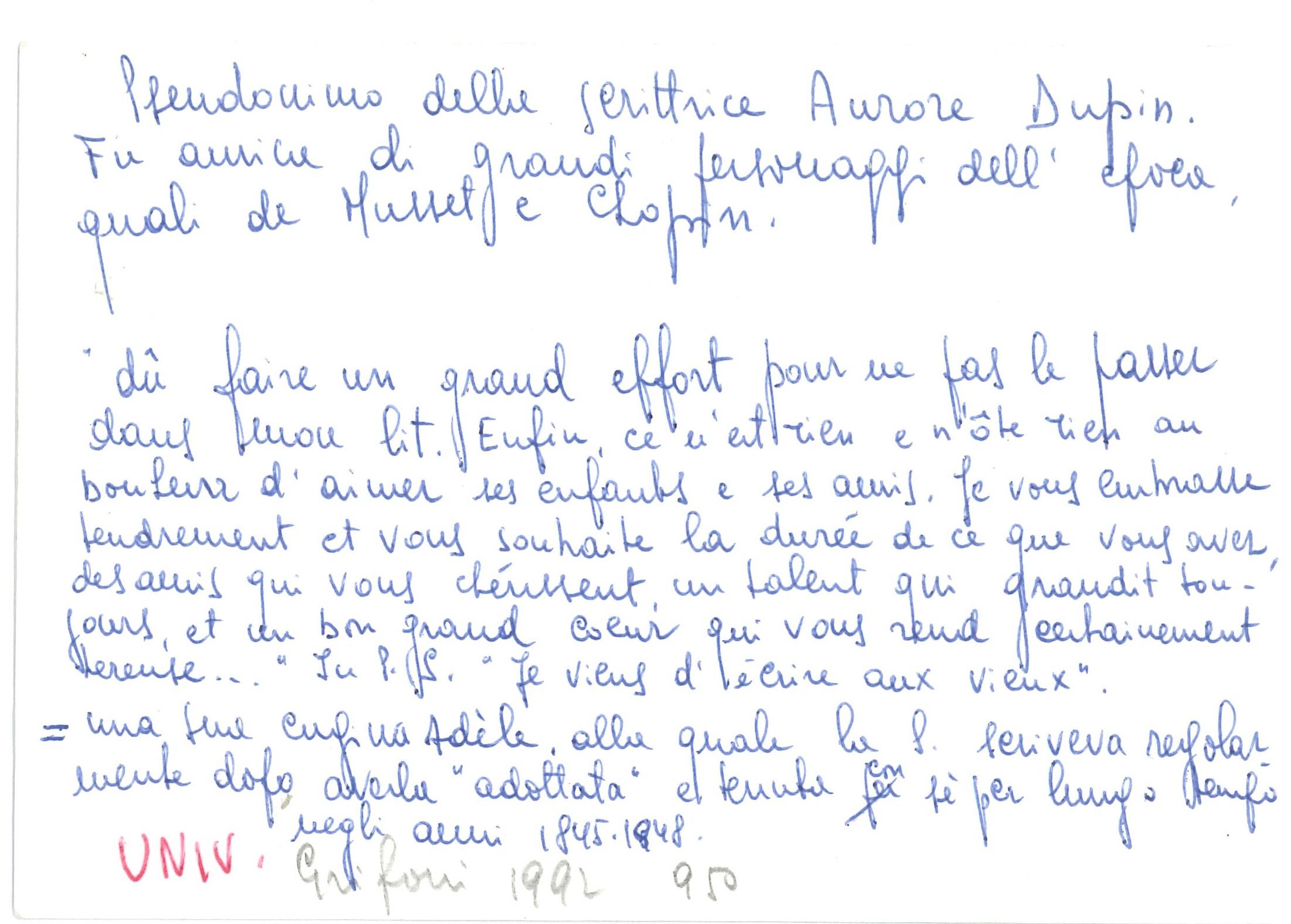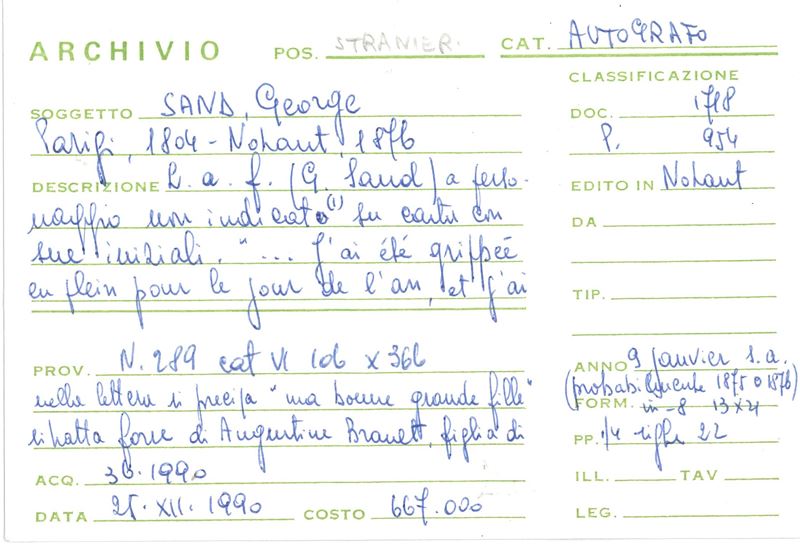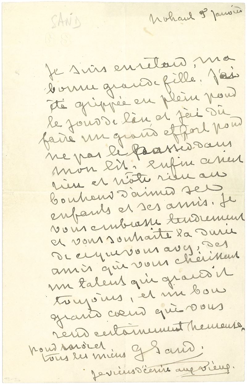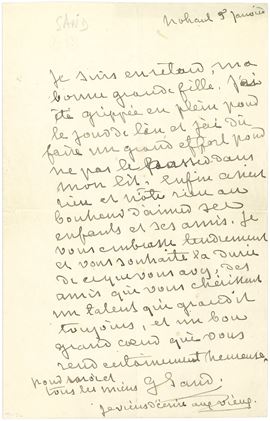 Sand George (1804-1876) Lettera autografa all'attrice Sylvanie Arnould-Plessy, presumibilmente datata 5.01.1874