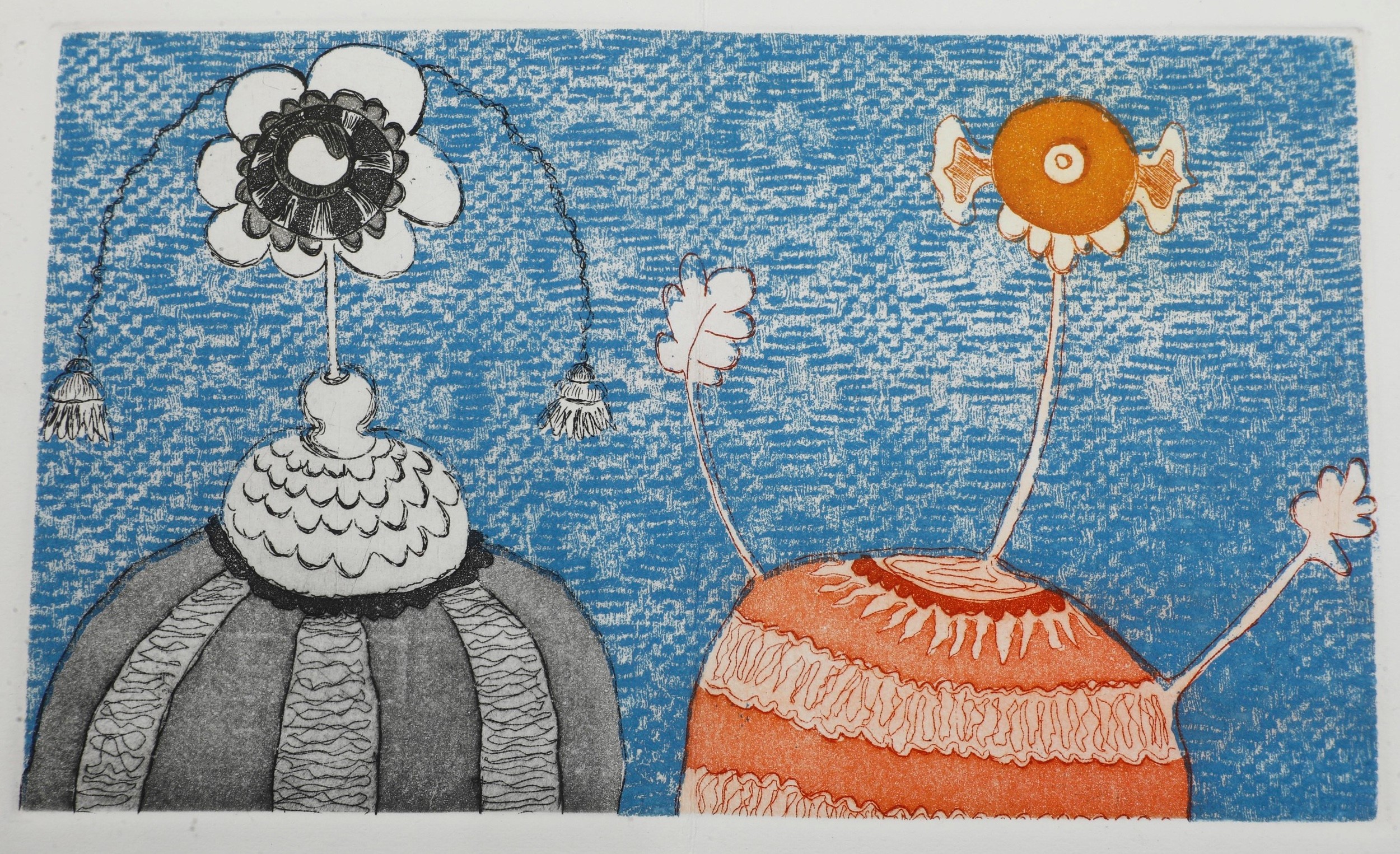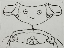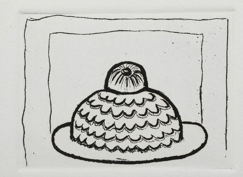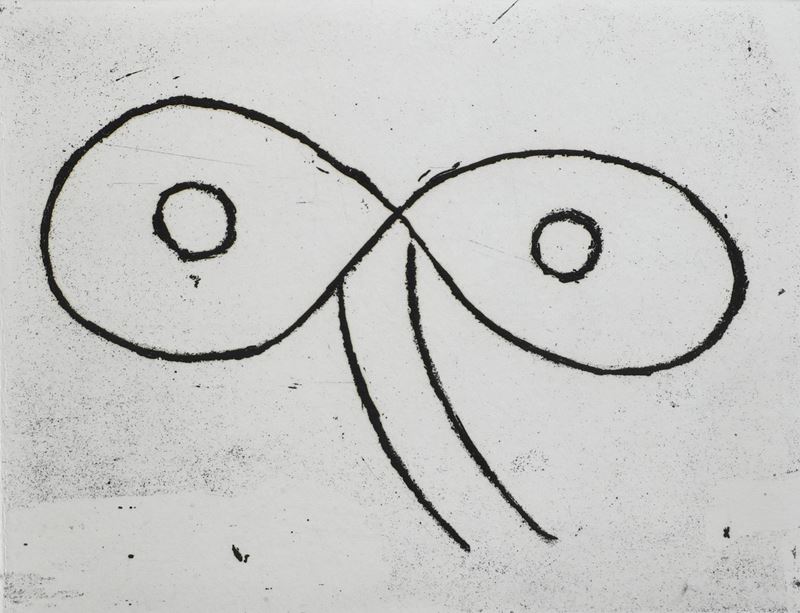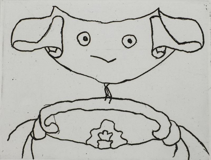 In 8°. (40 pp.) Fogli sciolti. Con 10 acqueforti a colori di Enrico Baj, di cui una a doppia pagina ed una in copertina, e una poesia di Sanguineti. Brossura editoriale illustrata a colori, custodia in cartonato rivestita all'interno con carta marmorizzata. Esemplare n. 96 (di 125) firmato al colophon da Sanguineti e da Baj.