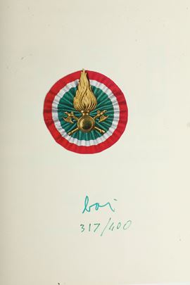 In-4°. Rilegatura in pelle editoriale, sovracopertina illustrata da Baj e copertina trasparente. Firma di Baj e tiratura (317/400) in principio. Dieci tavole a colori, di cui nove a piena pagina e una più piccola iniziale. Dodici cubi di legno con una sezione di una delle stampe di Baj su ogni lato. Buon esemplare.