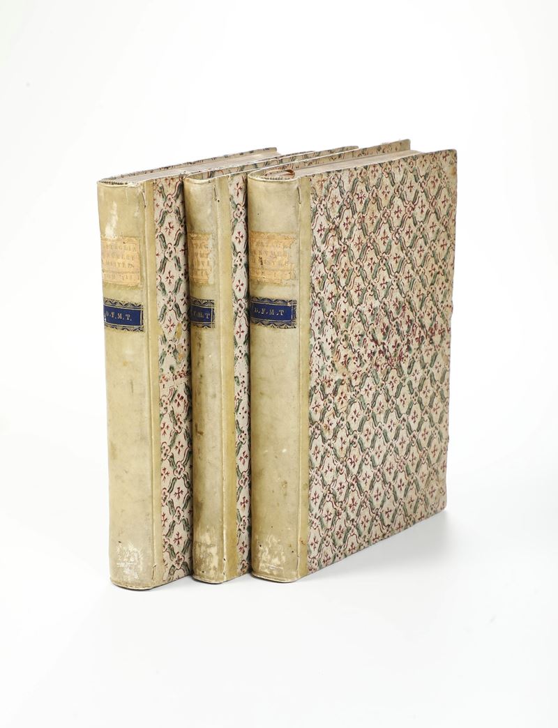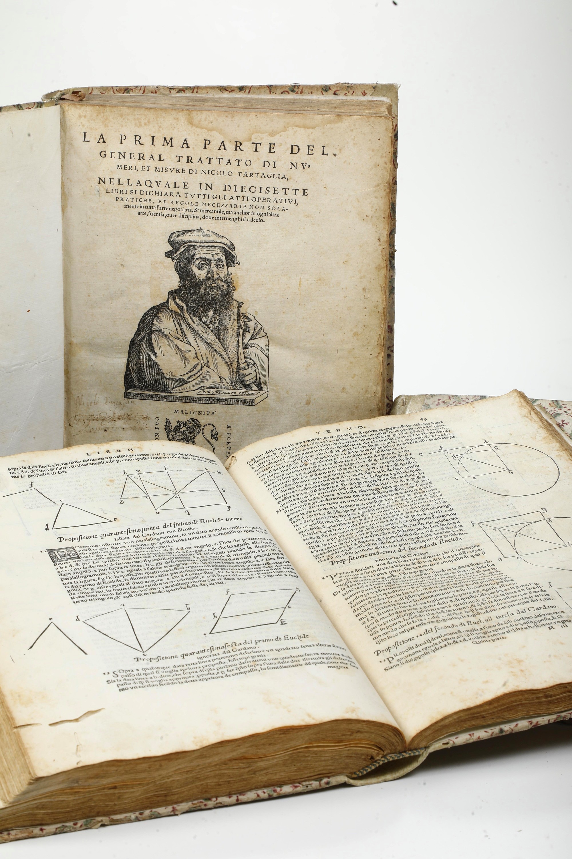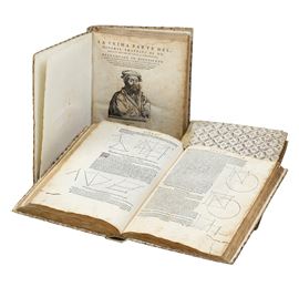 Sei parti in tre voll. in-folio (cm 30x20,8). I. 5 cc. nn. (manca una bianca) + 278 cc. num. (manca 1 bianca); II. 4 cc. nn. + 180 cc. num. ultime 7 cc. aggiunte manoscritte; III. 4 cc. nn. + 51 cc. num. + 1 c. bianca + 4 cc. nn. + 63 cc. num. + 1 c. bianca + 4 cc. nn. + 90 cc. num. + 4 cc. nn. + 44 cc. num. Rilegatura in mezza pergamena con tasselli al dorso del secolo XVIII(usure). Frontespizio con fregio xilografico e ritratto dell'autore (in alcune parti del trattato spostato nelle carte successive). Opera ricca di tavole matematiche e illustrazioni geometriche. Esemplare fresco, un po' corto al margine inferiore, con alcuni difetti. Si segnala, in particolare, la sostituzione delle ultime sette carte della seconda parte con fogli manoscritti.