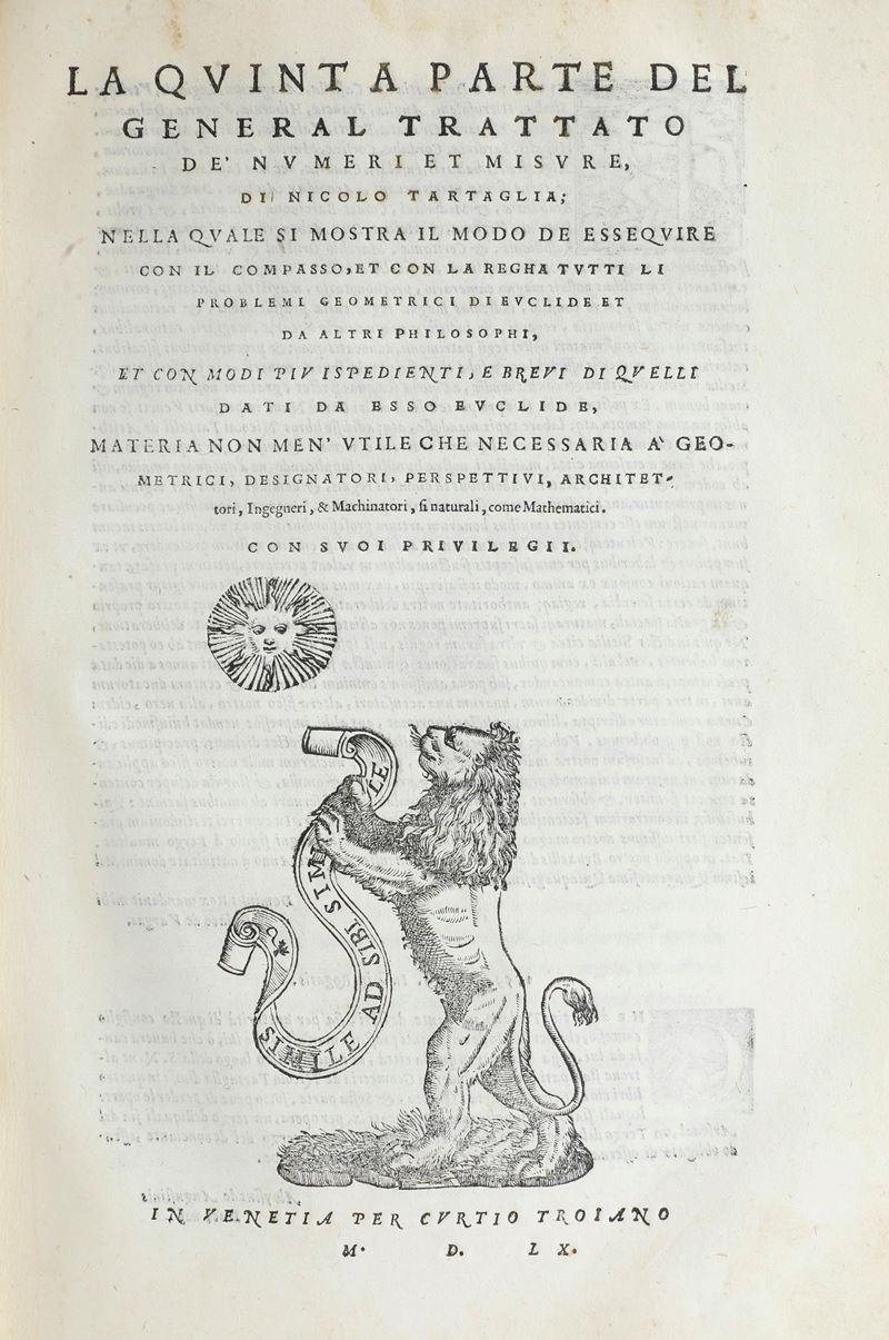 Tartaglia Niccolò (1499? - 1577) La prima (-sesta) parte del general trattato di numeri, et misure... In Vinegia per Curtio [..]
