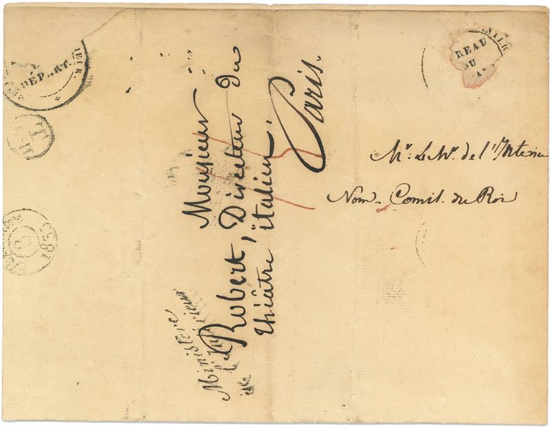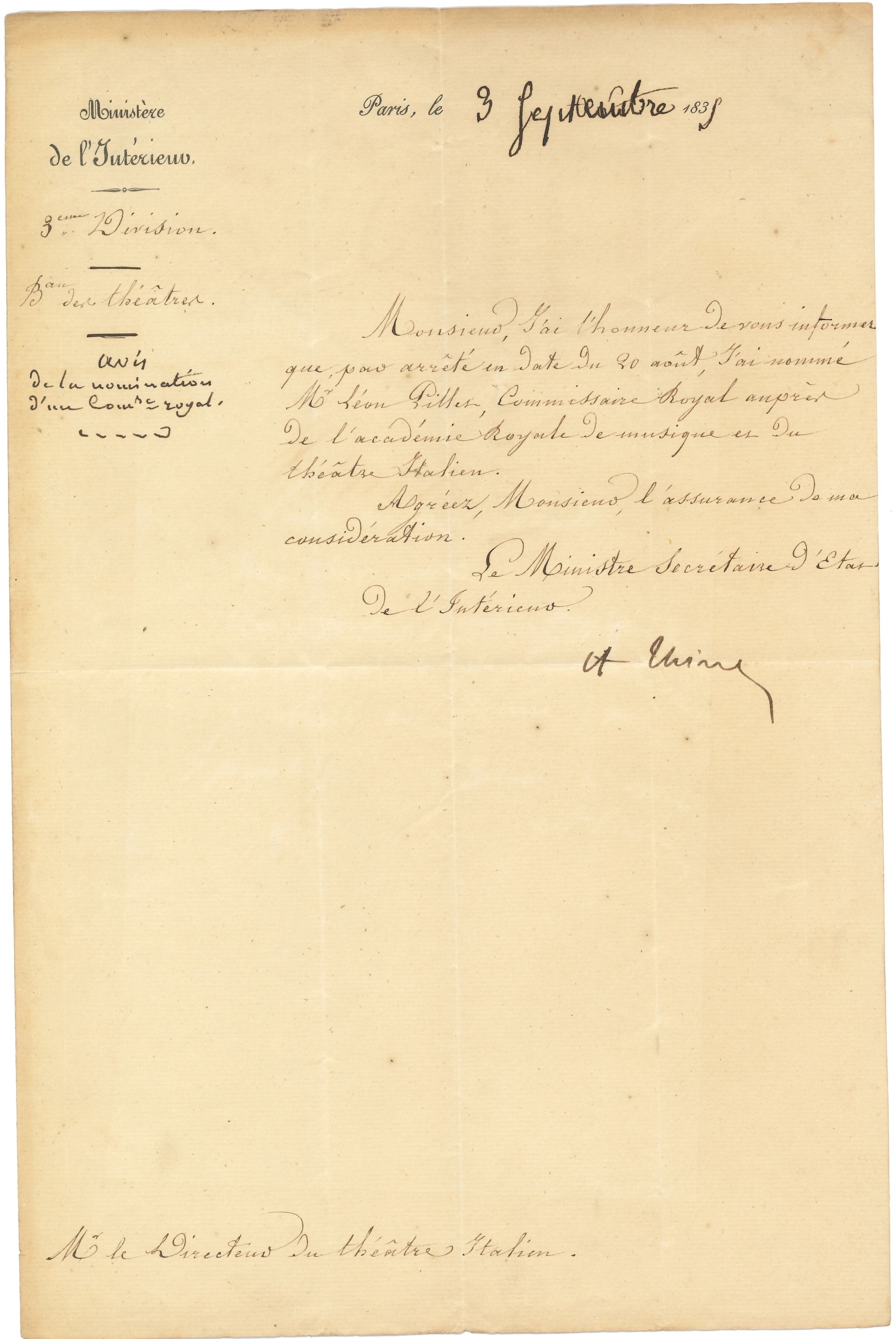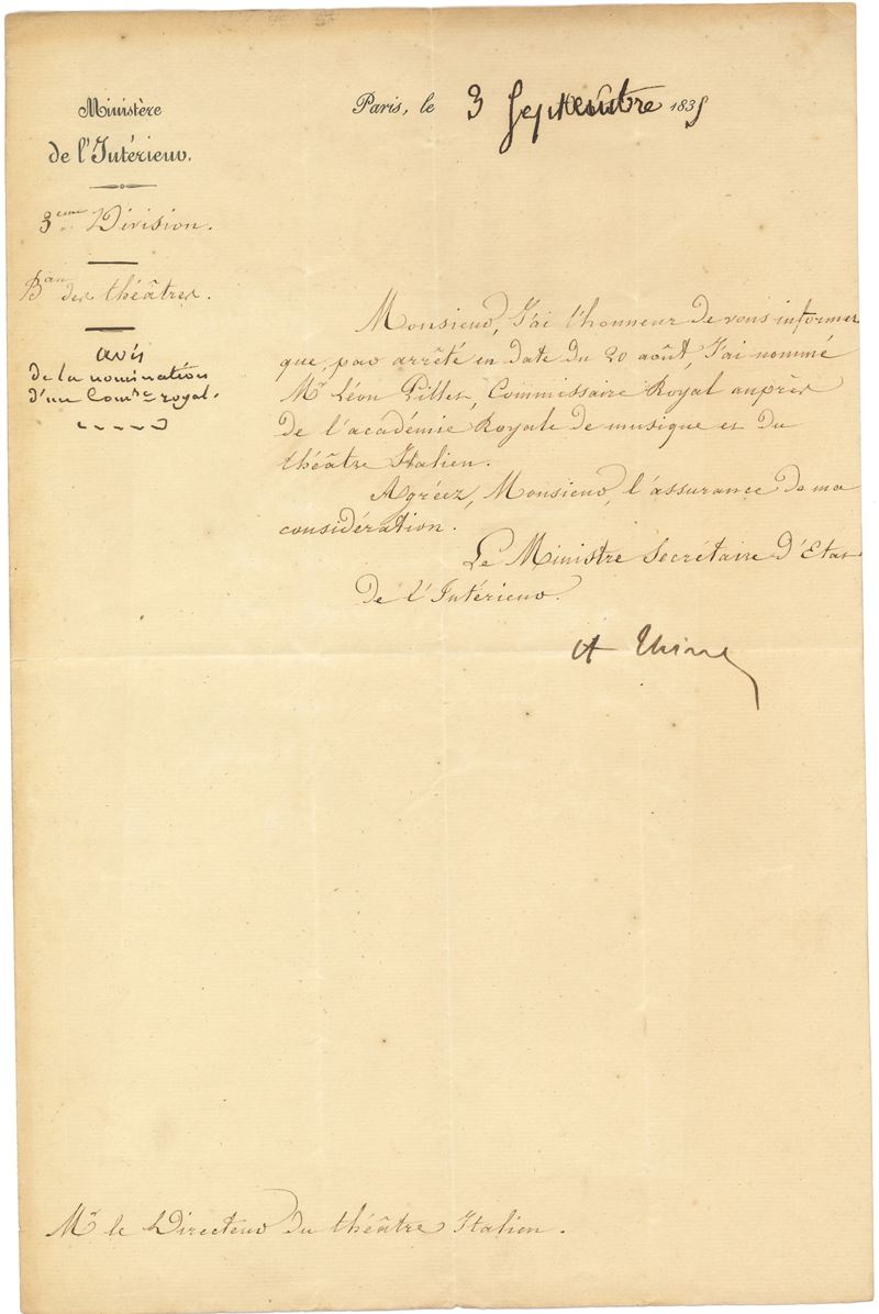 Documento datato Parigi, 9-09-1839. Una facciate manoscritta e una con indicazione del destinatario, su carta vergellata e filigranata. Lo statista informa della nomina di Léon Pillez a Commissario reale presso l'Accademia Reale di Musica e del Teatro italiano