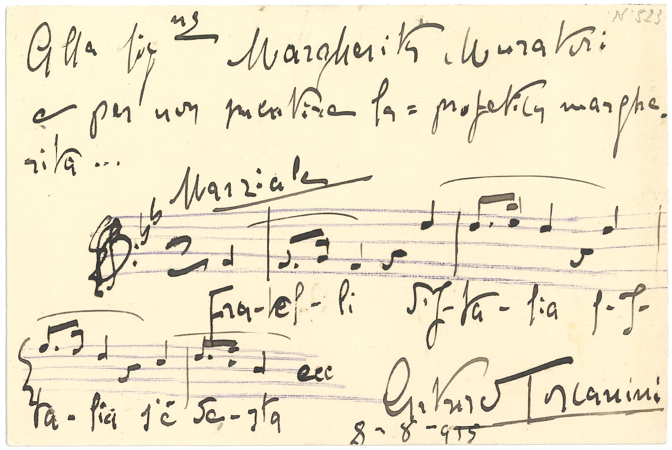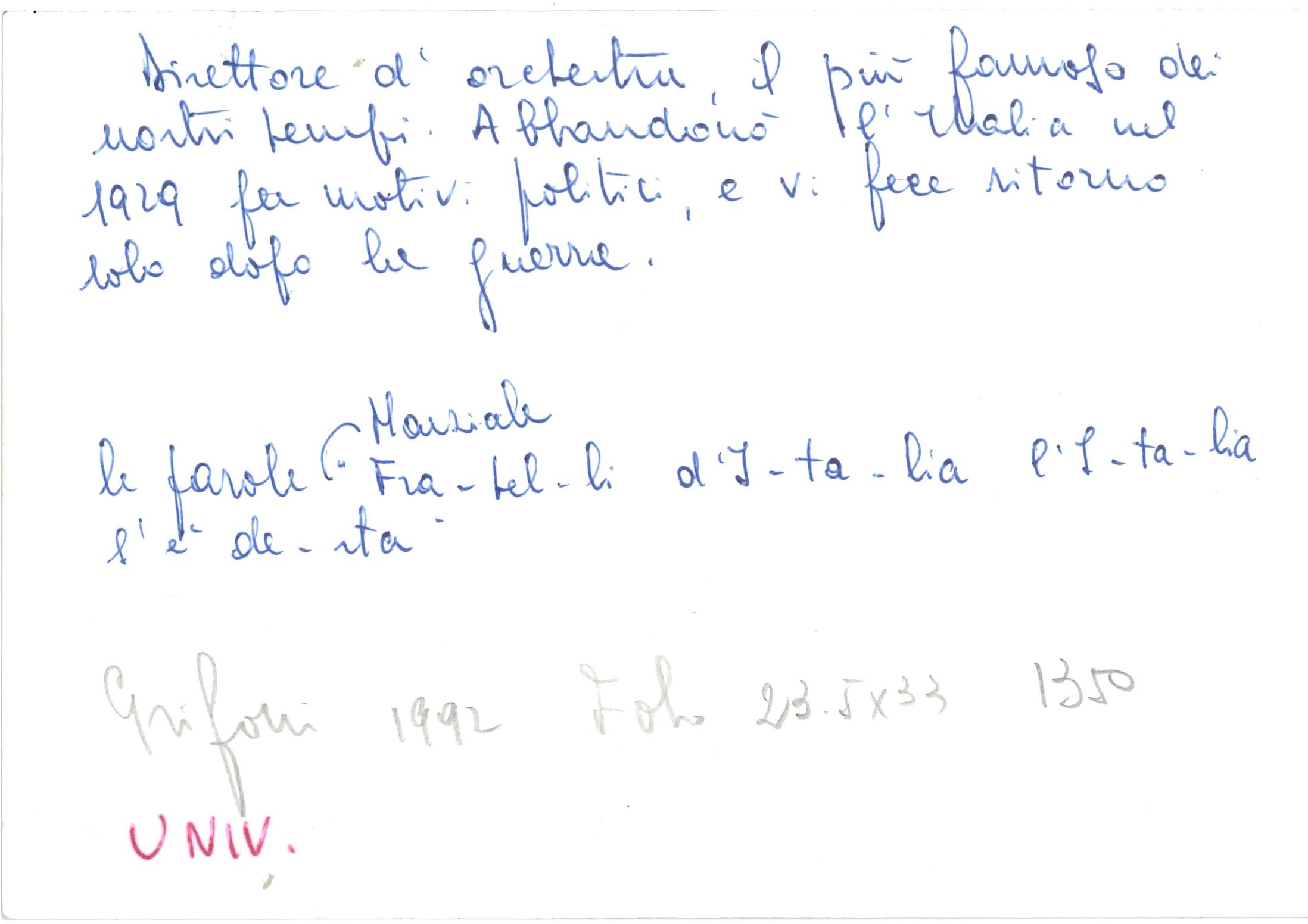 Documento firmato e datato 8-8-935 (?). Cartoncino contenente cinque battute su due righe dell'inno italiano. Dimensioni mm 138x93