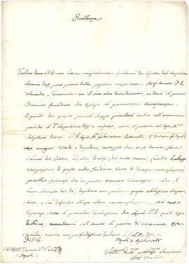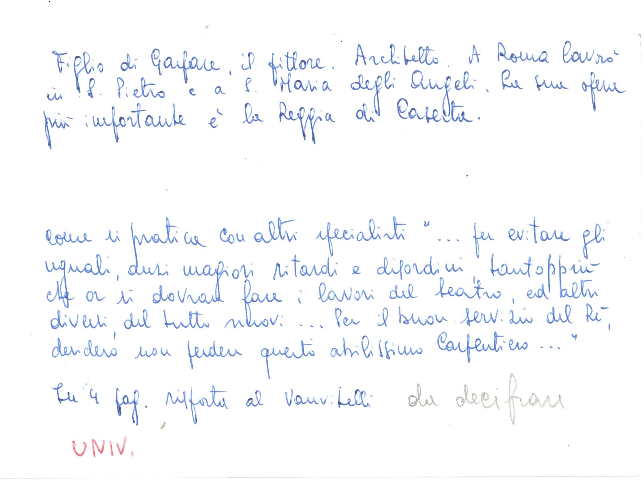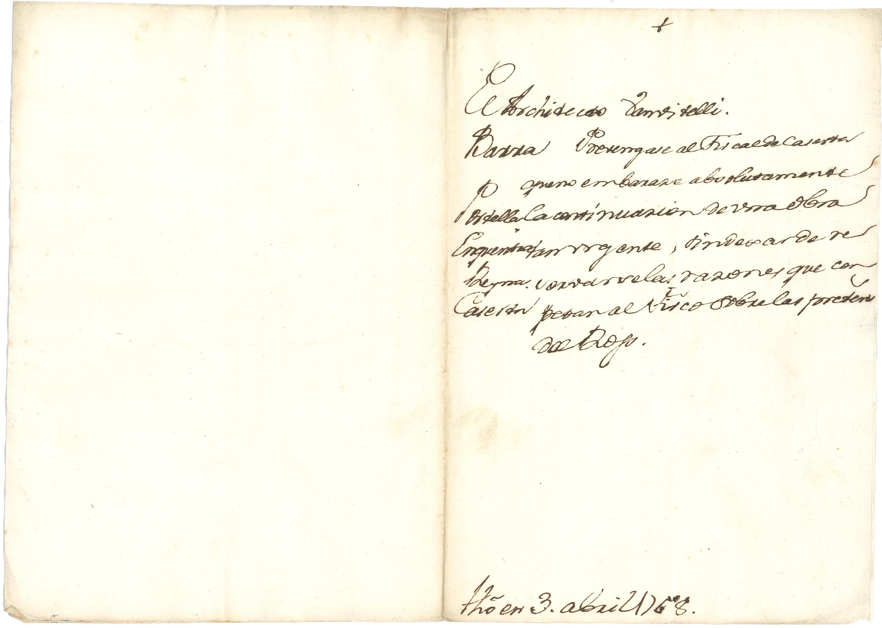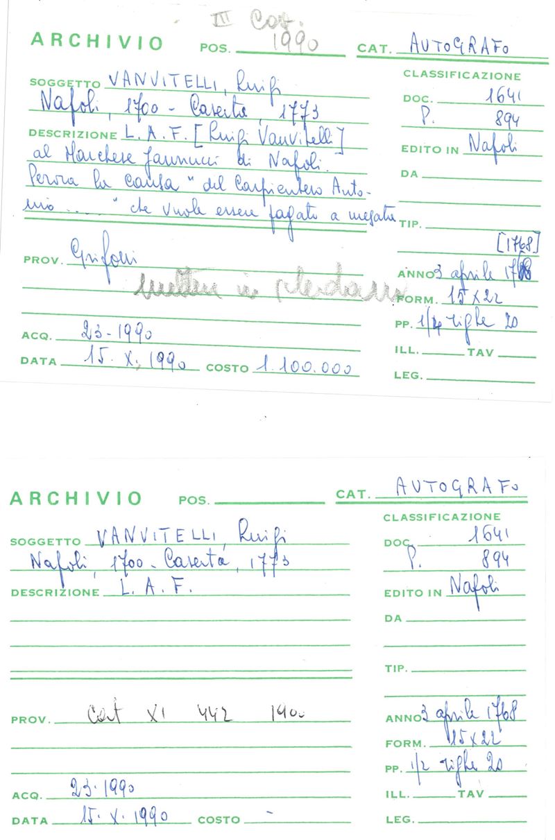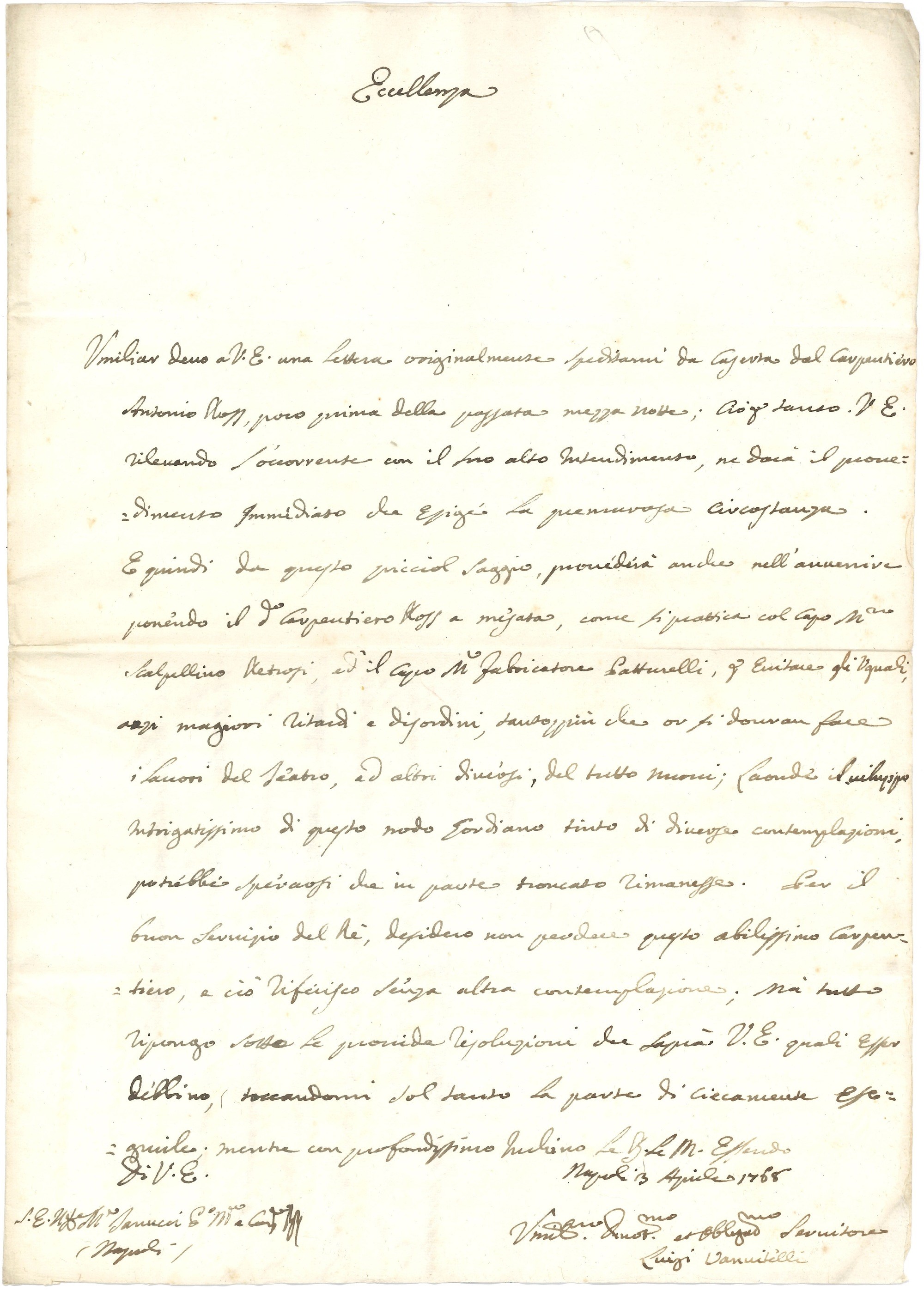 Documento datato Napoli, 3.04.1768. Due facciate manoscritte. Vanvitelli perora con il potente ministro la causa di un valido artigiano con cui collabora