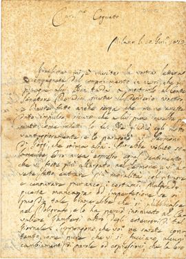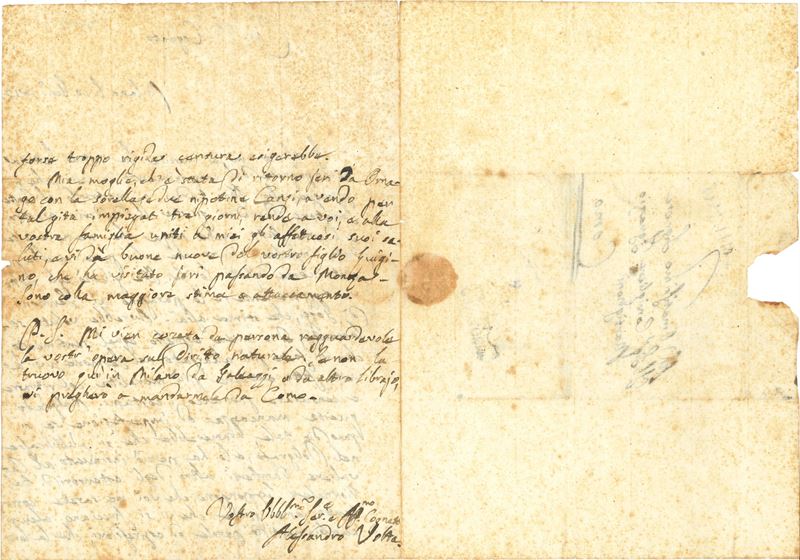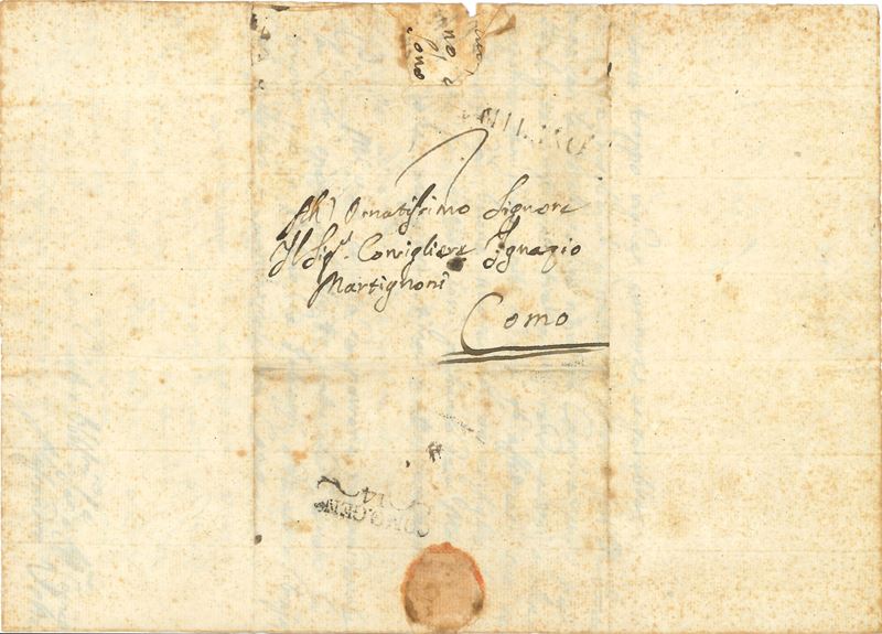 Interessante lettera datata Milano, 10-01-1812, relativa ad un componimento in versi del Martignoni molto lodato dal Volta. Due facciate manoscritte e una con i dati del destinatario della lettera e traccia di sigillo (piccola mancanza al margine senza perdita di testo, foxing)