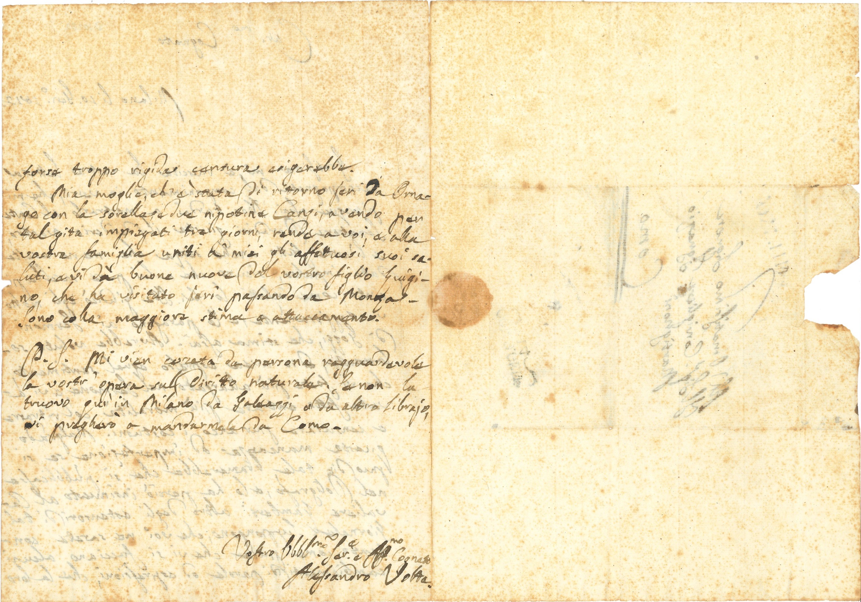 Volta Alessandro (1745-1827) Lettera autografa al cognato Ignazio Martignoni