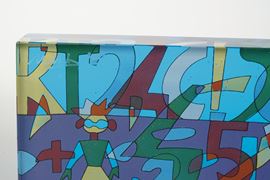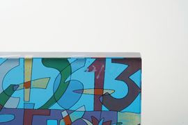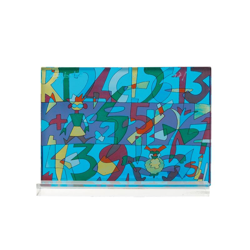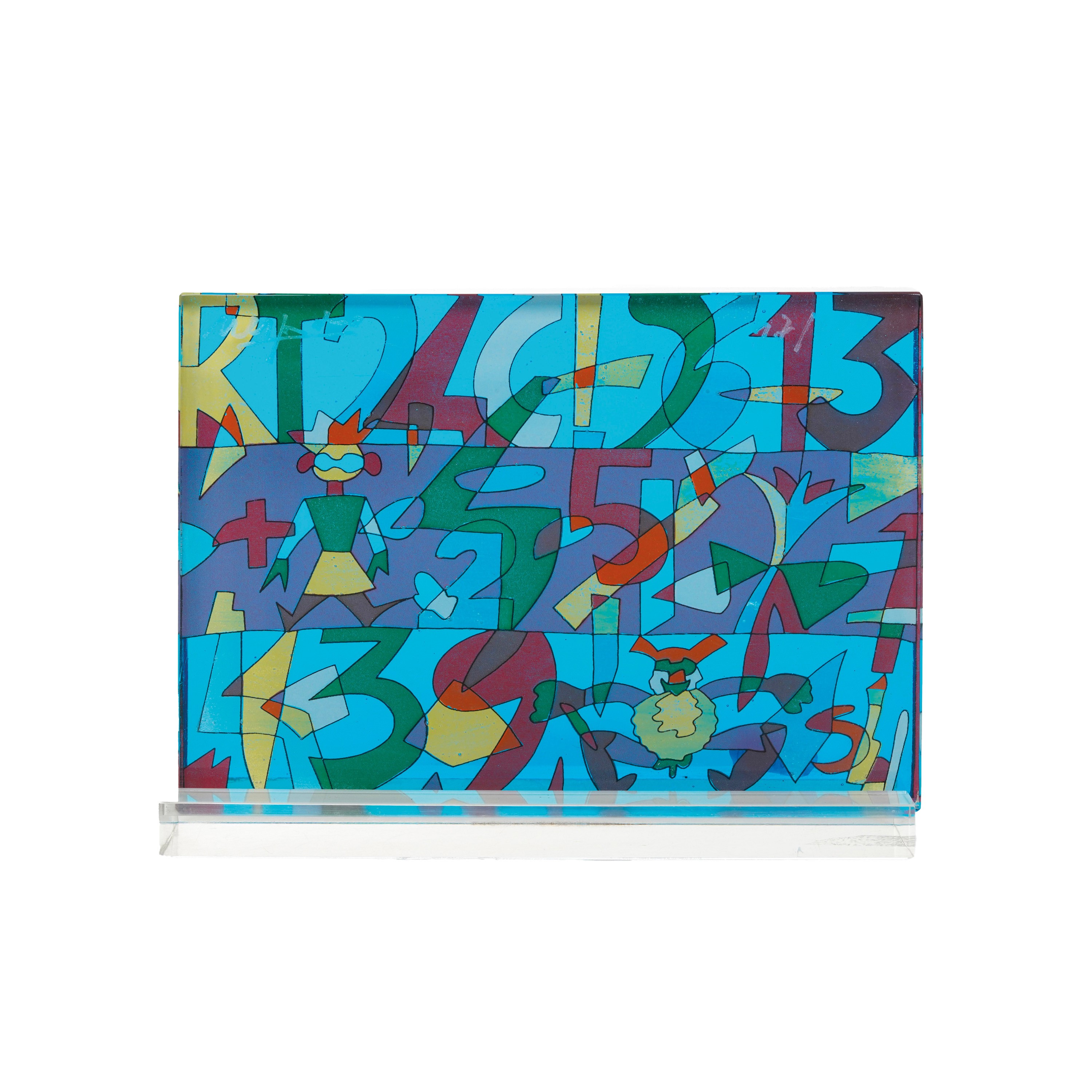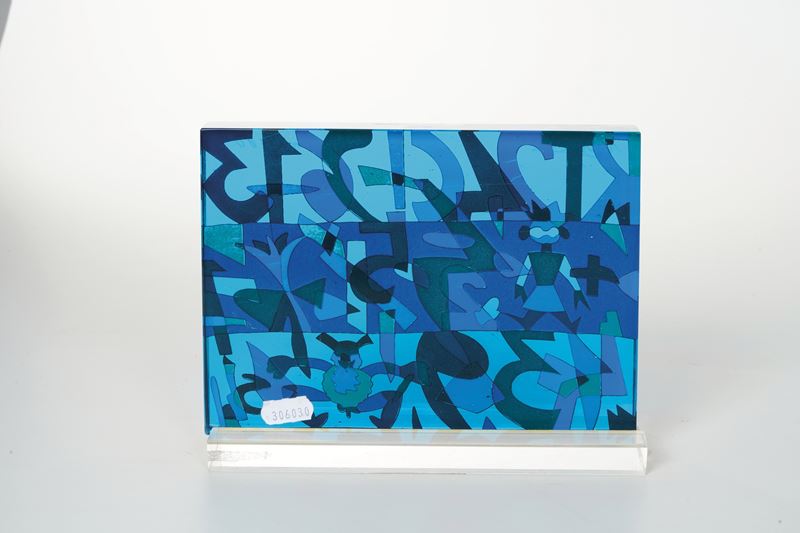 multiplo-scultura in cristallo di Murano con inclusione policroma su base in plexiglass
