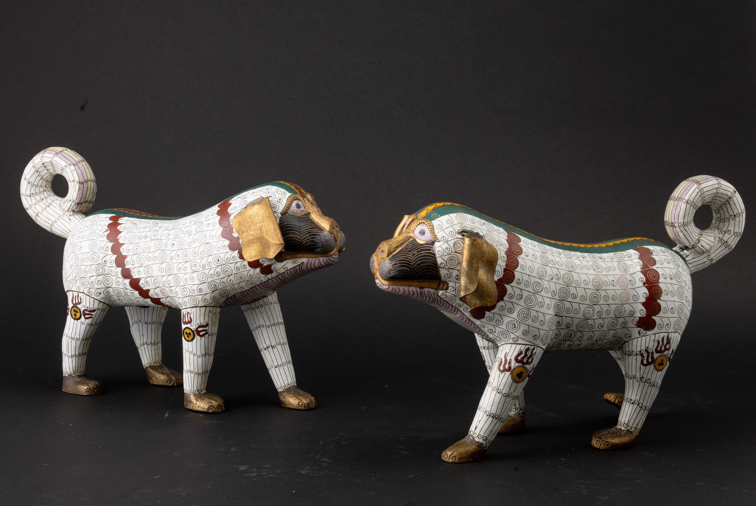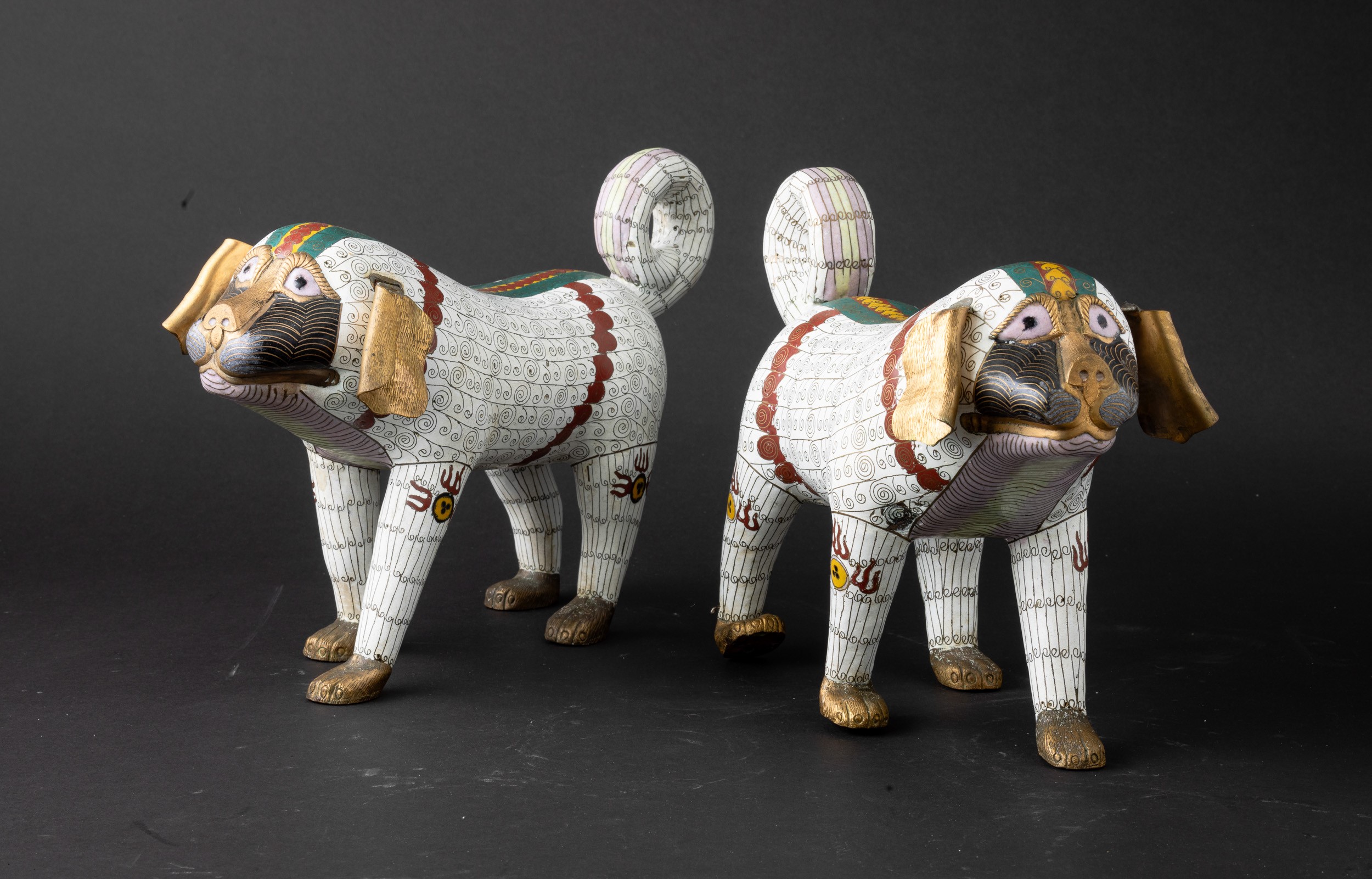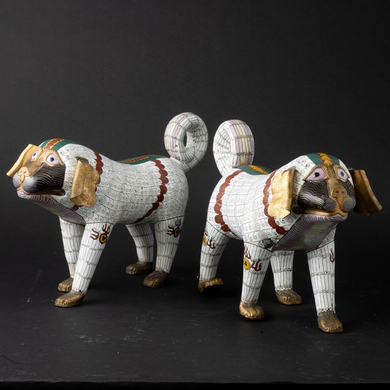 Coppia di figure di cani di Pho a smalti policromi cloisonné, Cina, Dinastia Qing, XIX secolo