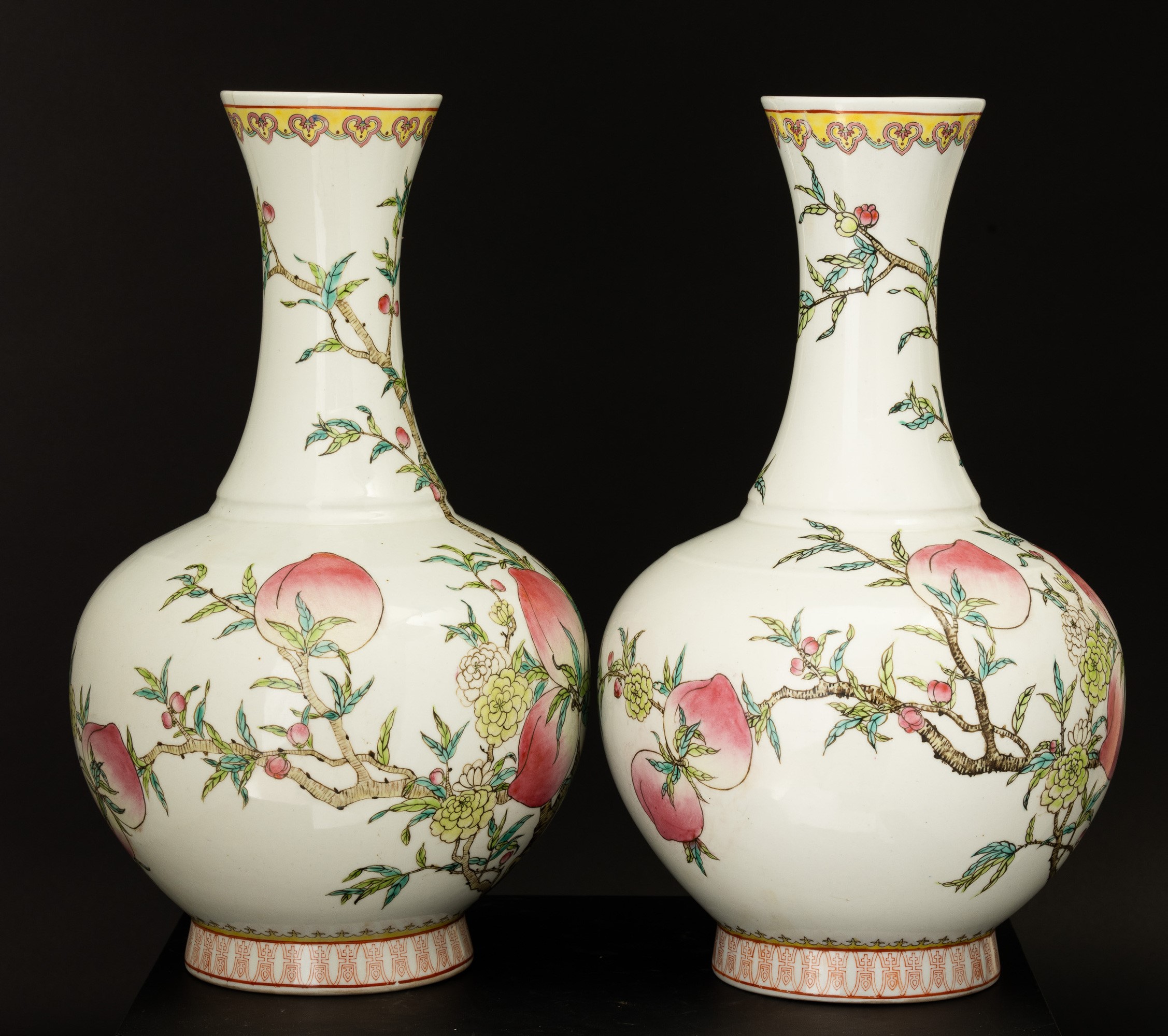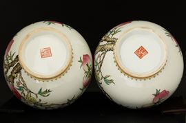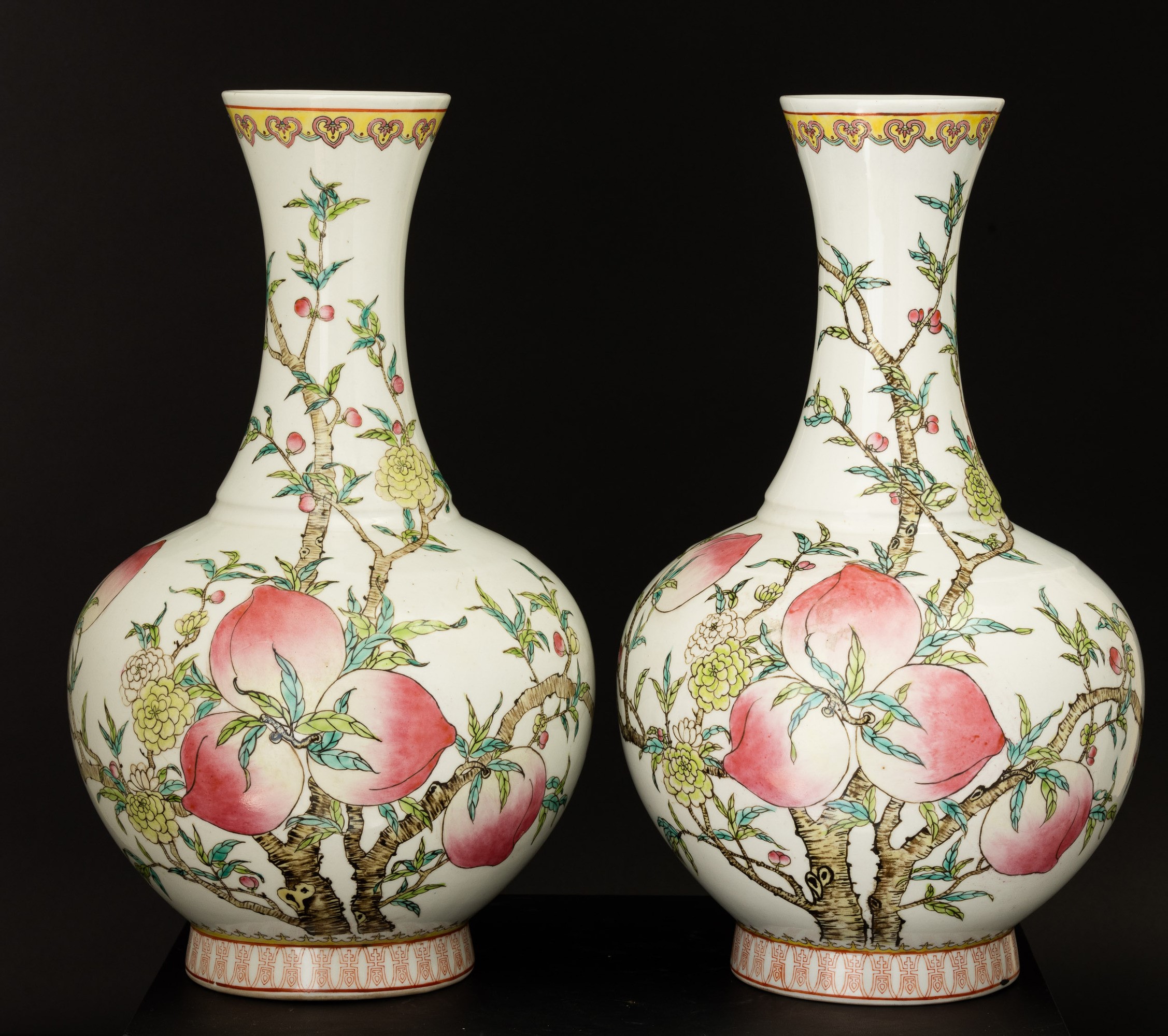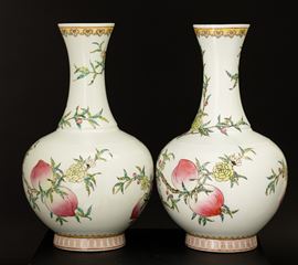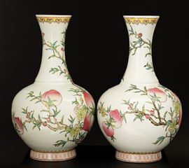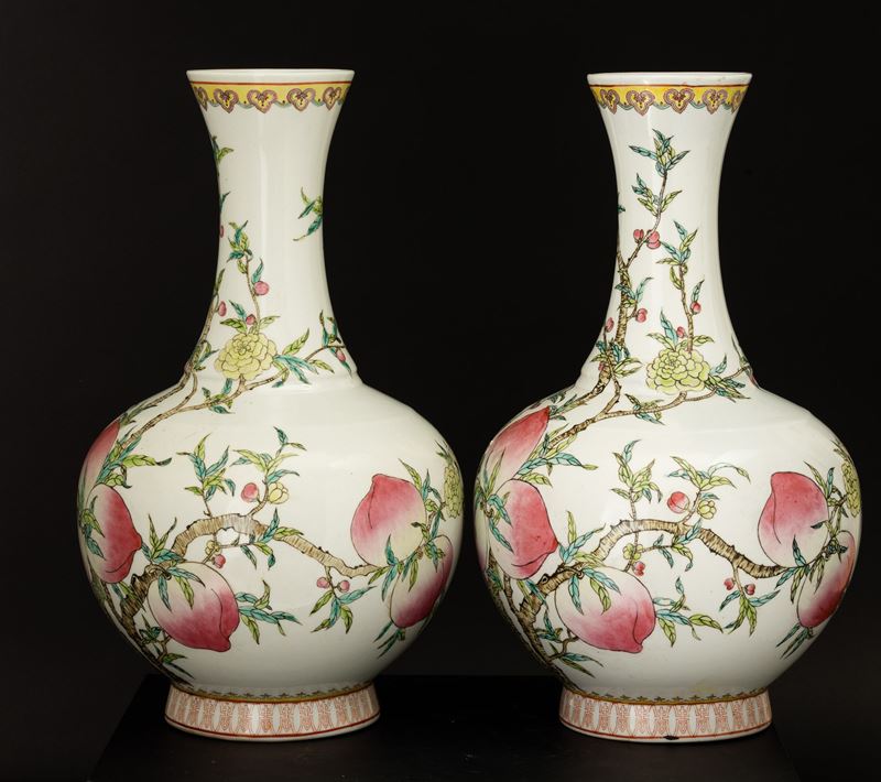 Coppia di vasi in porcellana policroma con decoro a fiori, rami e pesche Cina, Dinastia Qing (1644-1912)