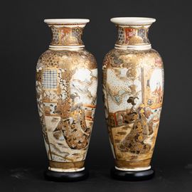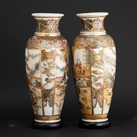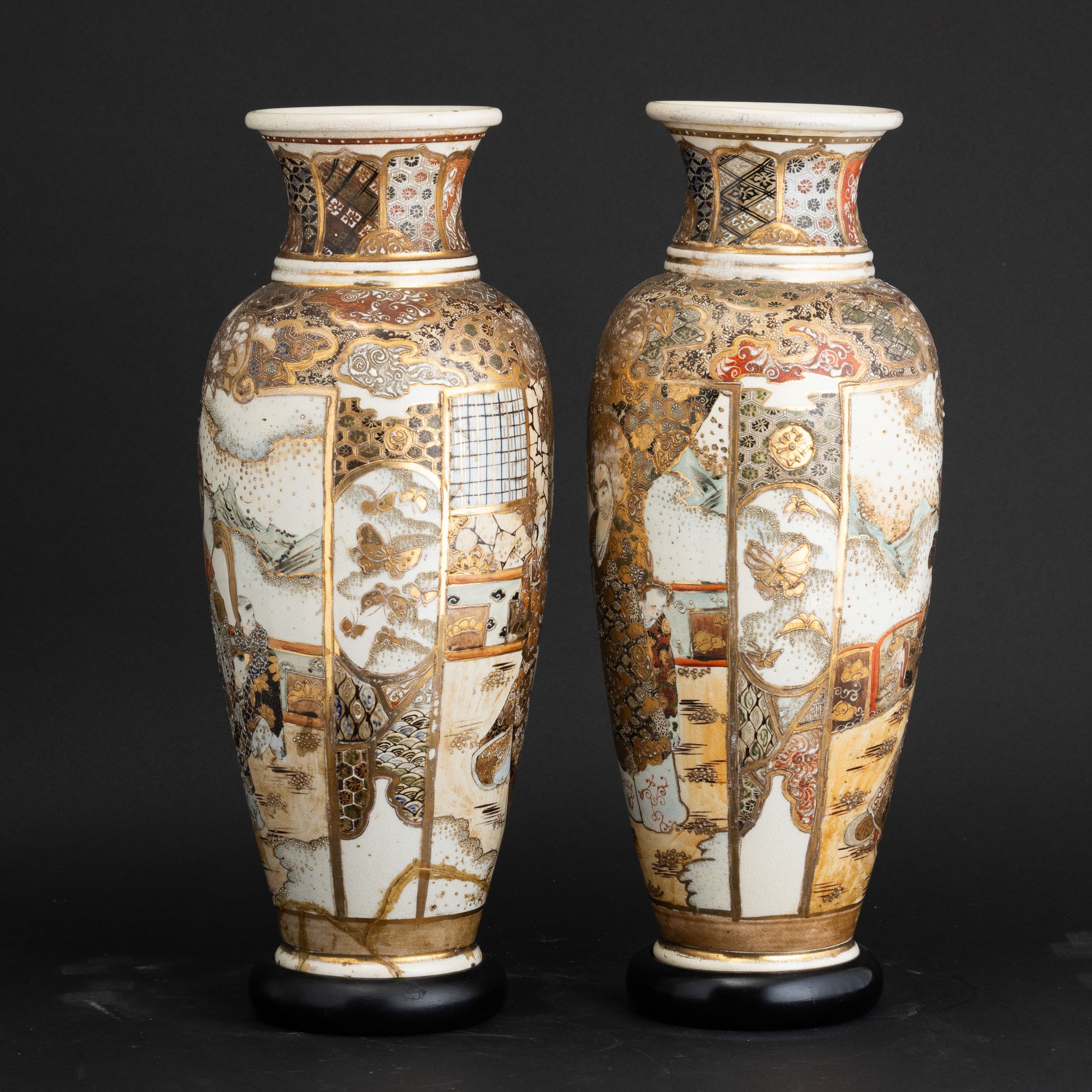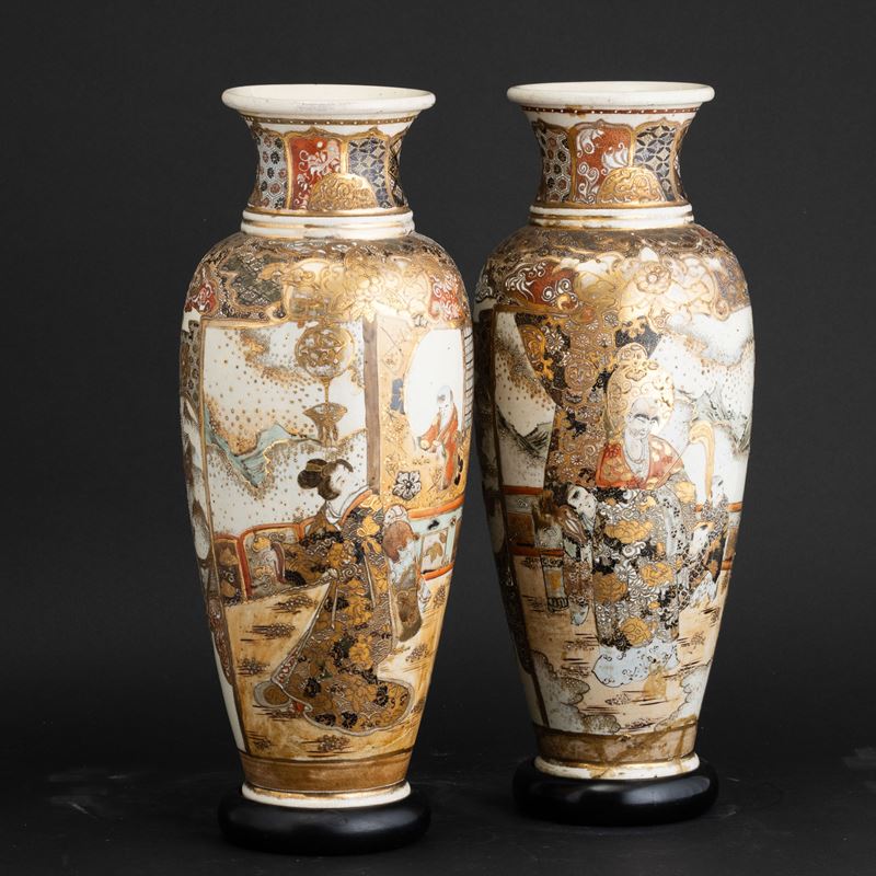 Coppia di vasi Satsuma raffigurante scena di vita di corte, Giappone, periodo Meiji (1868-1912)