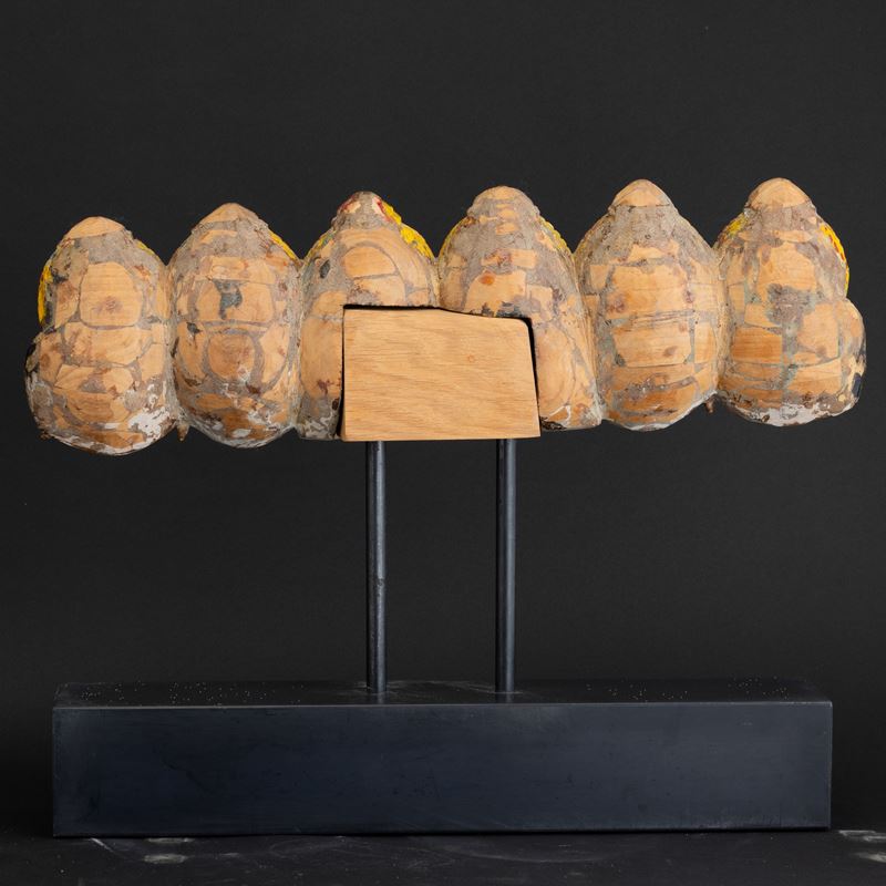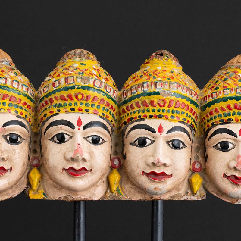 Gruppo di sette teste in legno scolpito e dipinto, India, XIX secolo
