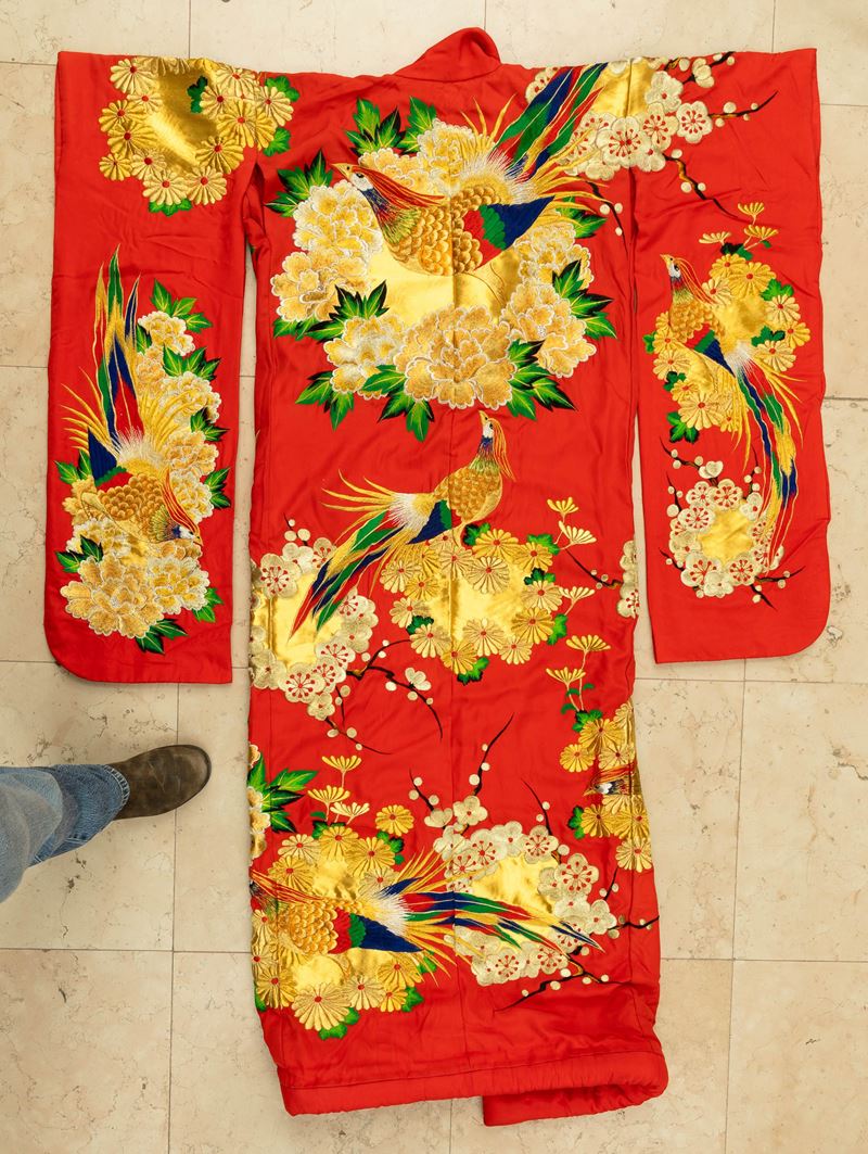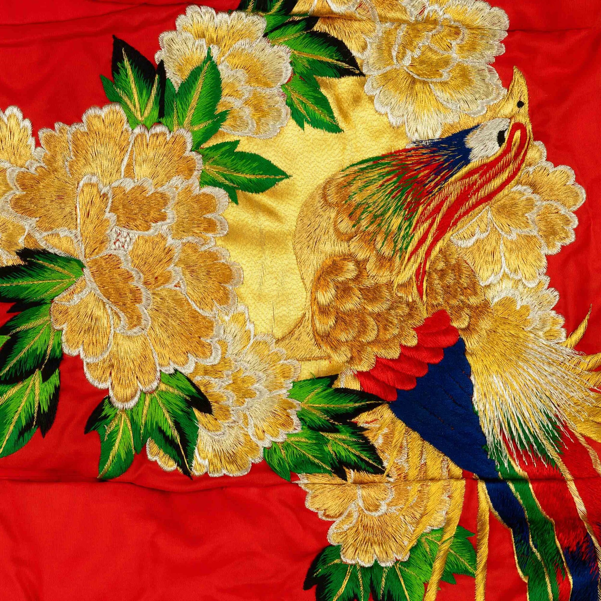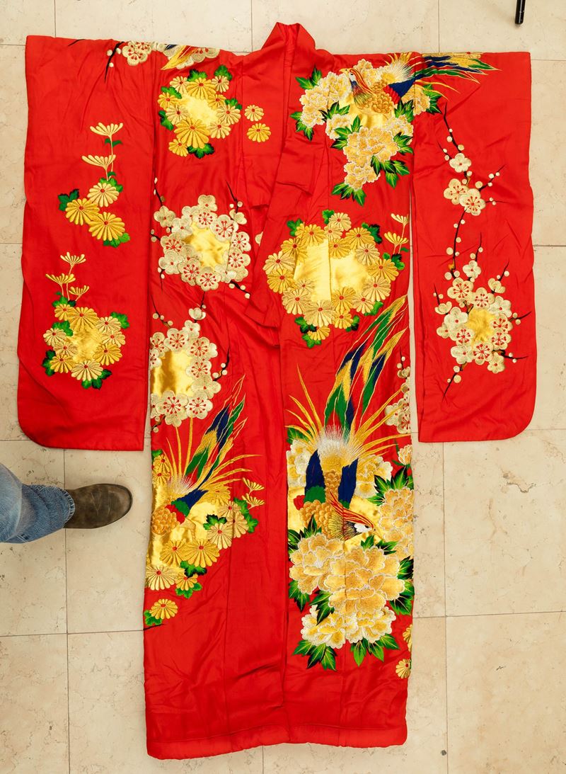 Kimono cerimoniale in seta rossa ricamato a motivi naturalistici, Giappone, XX secolo